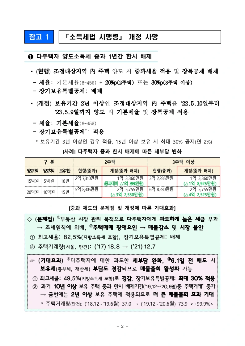 한 번 살펴볼까요? 아래는 조정대상지역에서 1년간 양도소득세 중과를 한시적으로 배제 받게 되는 경우의 개정 내용과 사례를 든 세 부담에 대한 예시입니다. 10일부터는 기존에 적용되던 2주택 20프로 중과, 3주택 이상 30프로 중과 적용을 받지 않고 기본세율(6-45%)가 적용되는 것이지요. 또한 다주택자도 3년 이상 보유한 주택의 경우 장기보유특별공제에도 해당이 됩니다. (15년 이상 보유했을 땐 최대 30% 공제받음)