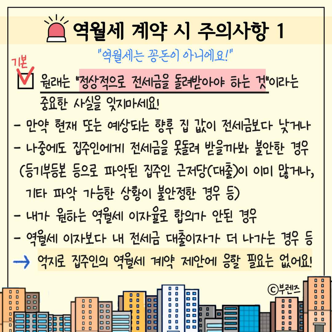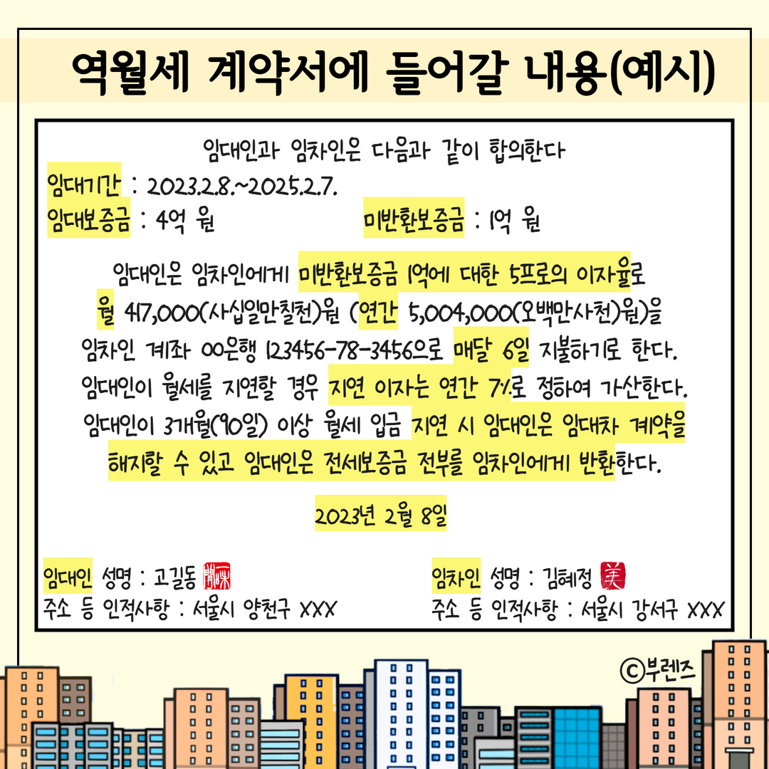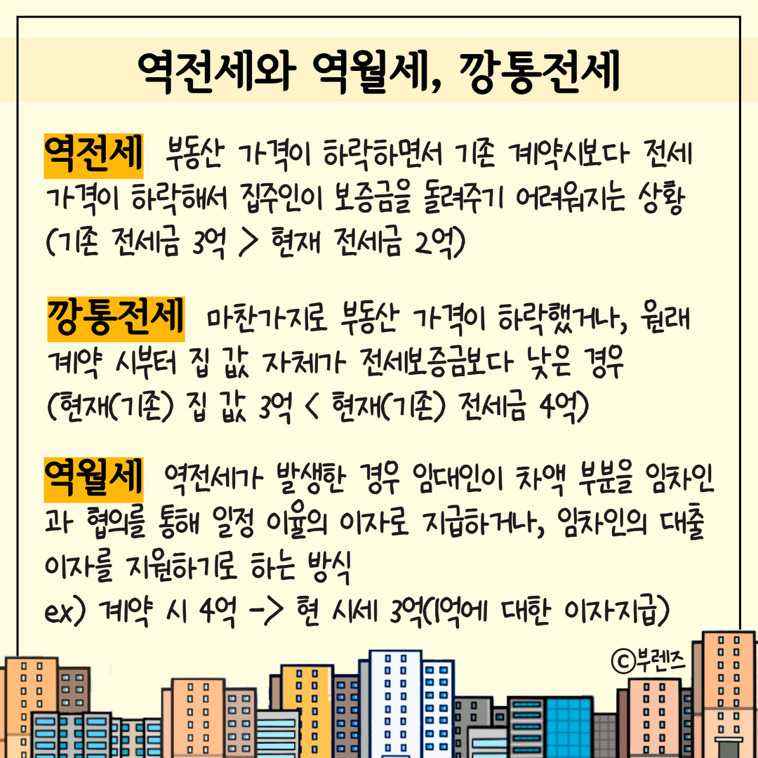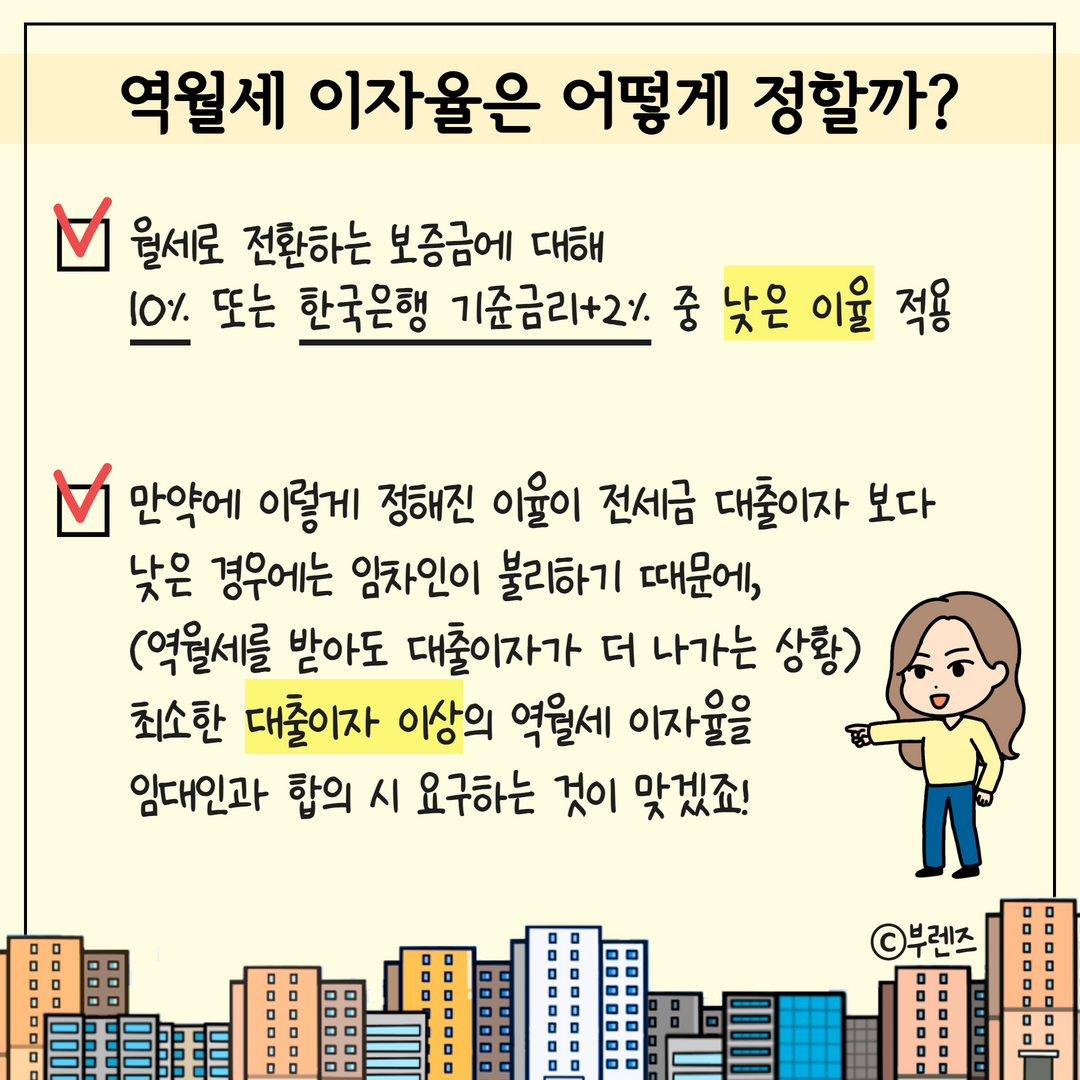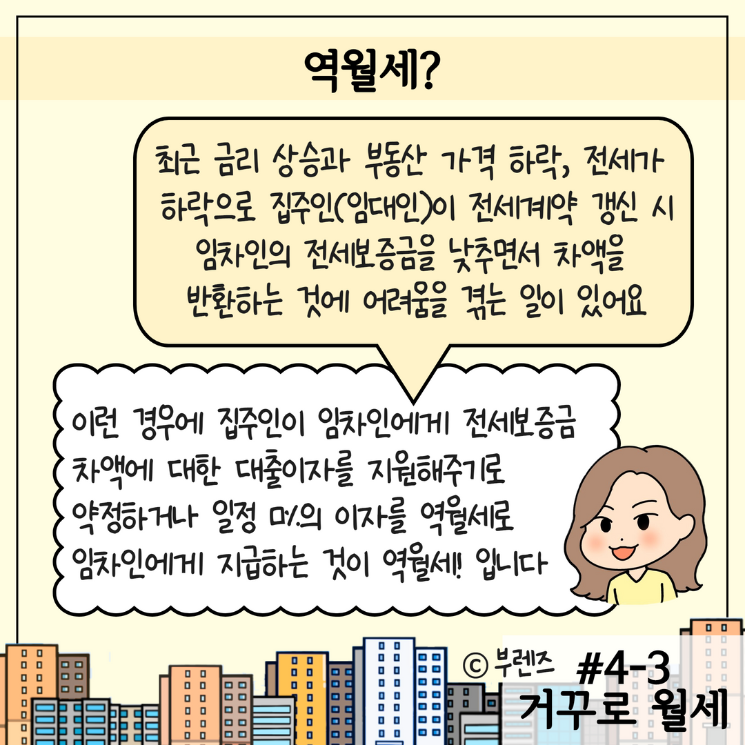 최근 금리 상승과 부동산 가격 하락, 전세가 하락으로 집주인(임대인)이 전세계약 갱신 시 임차인의 전세보증금을 낮추면서 차액을 반환하는 것에 어려움을 겪는 일이 있어요. 이런 경우에 집주인이 임차인에게 전세보증금 차액에 대한 대출이자를 지원해주기로 약정하거나 일정 ㅁ%의 이자를 역월세로 임차인에게 지급하는 것이 역월세! 입니다