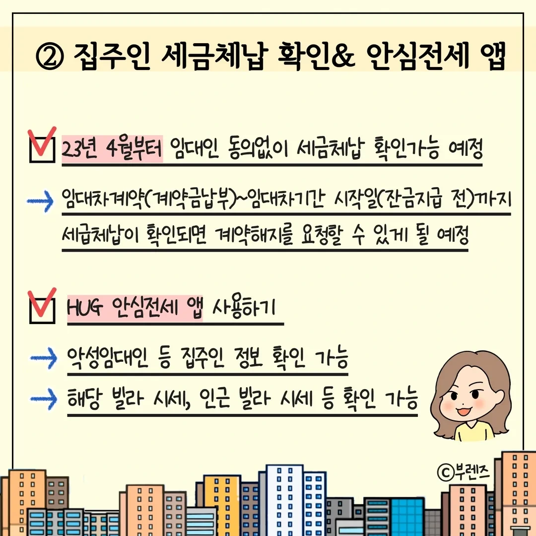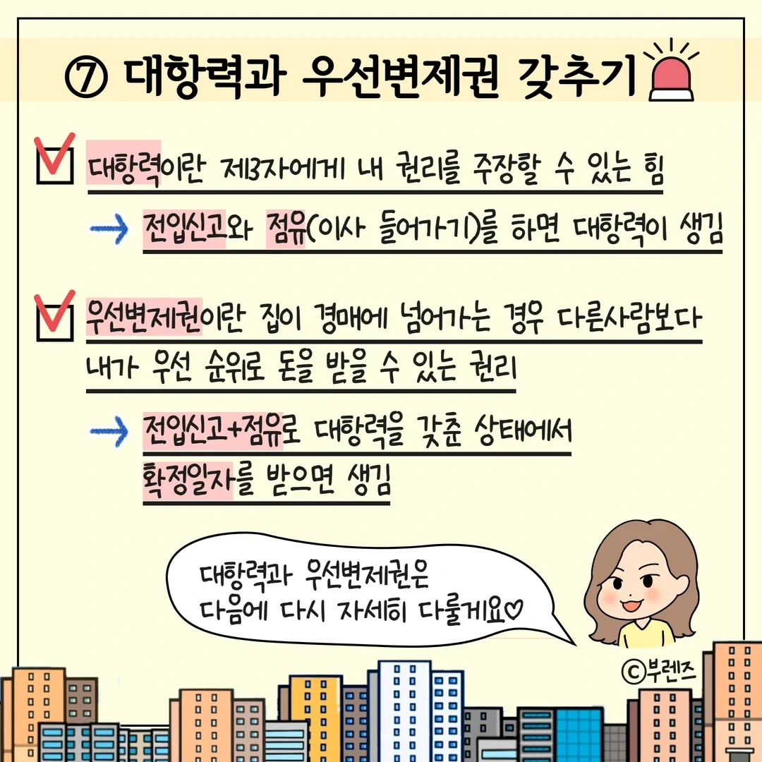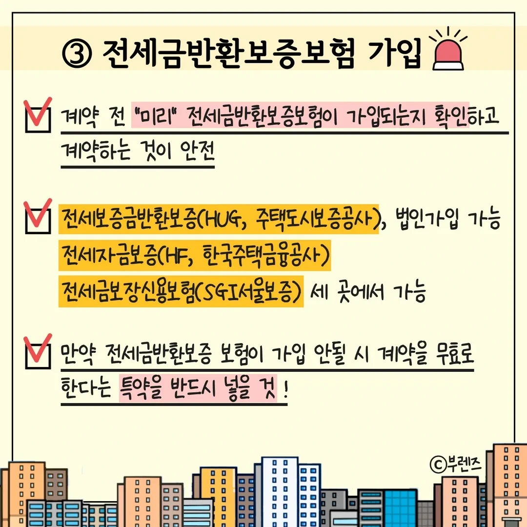 [1]등기부등본 갑구, 을구 확인 [2] 집주인 세금체납 확인 & HUG 안심전세 앱 활용 [3] 전세금반환보증보험 가입 - HF, HUG, SGI서울보증 3곳에서 가능 [4] 계약 시 임대인(집주인) 확인 [5] 계약 시 대리인 확인 [6] 계약 시 특약사항 기재 [7] 대항력+우선변제권 갖추기 - 전입신고+이사+확정일자
