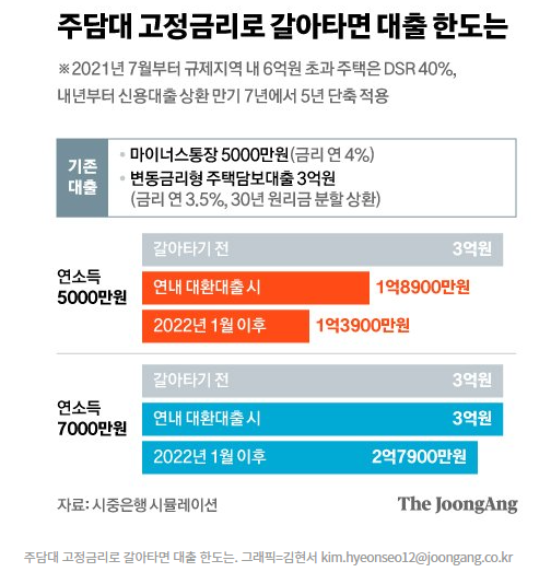 또 하나, DSR이 빡빡해지는 것도 문제인데 금리가 점점 올라간다는 기사도 연일 나오고 있는데요. 예를 들어서 이 금리를 피하기 위해서 만약 연봉이 5천만 원인 사람이 고정금리 상품으로 대출상품을 갈아타려고 하면 어떤 일이 생길까요? 기사의 예시가 이해하기 쉬워 가져왔습니다. 서울에 있는 6억 원짜리 집을 위해 대출을 신용대출 5천만 원에 주담대 3억 원을 받았습니다. 물론 변동금리로요. 그런데 자꾸 올라가는 금리가 부담이 되어 고정금리 상품으로 대환대출을 하여, 즉 갈아타기를 하면 어떻게 되느냐? 금리는 조금 안심될지 몰라도 문제는 이전만큼 대출 총액이 안 나온다는 것입니다. 연봉이 5천만 원인데 DSR이 40프로이면 2천만에 해당되는데 딱 주담대와 기타 대출의 원리금의 상한선 안에서 빌려주기로 했으니, 그렇게 계산하면 총대출금이 3억 5천만 원이 아니고 1억 8천9백만 원이 됩니다. 6억 원의 집을 매수하려면 최소 4억 원 이상의 현금이 있어야 한다는 이야기가 되겠네요. 집을 매수한다는 것에는 규제지역에 있는 아파트 청약도 포함이 되고 이 규제는 더 빡빡해지고 있으니 청약만을 간절히 원하던 분들에게도 더욱 한숨이 나오는 소식이 아닐 수 없습니다.