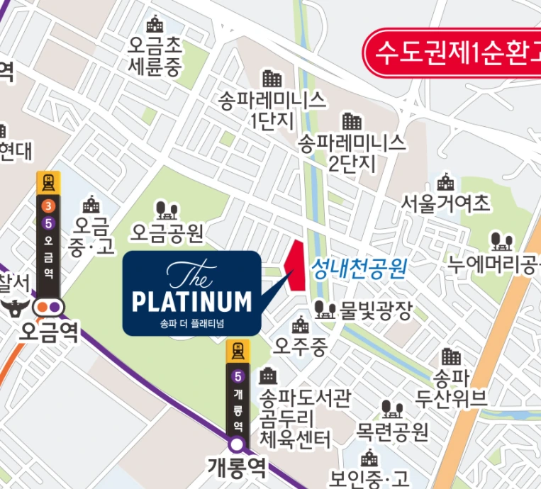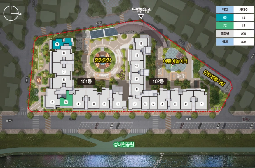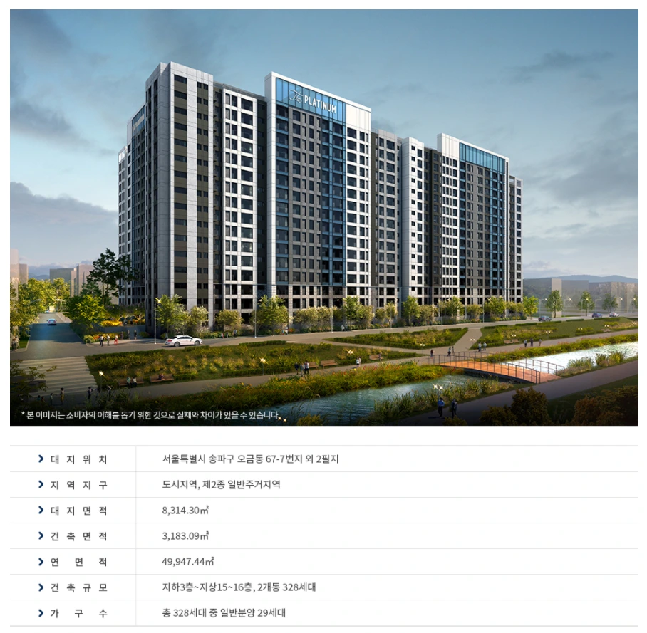 구 아남 아파트의 모습입니다. 1992년 준공된 아남 아파트는 299세대 ㄴ자 모양 2동으로 이루어져 있는데요, 여기서 아래 단지 배치도의 9번 10번으로 표시된 부분에 각각 65타입 14세대 72타입 15세대의 일반 물량이 생겼습니다. 바로 앞에 잔잔하게 성내천이 있고 오금공원과도 가깝죠. 지하철은 3호선 오금역과 5호선을 이용합니다. 기존 용적률이 높아 재건축은 일찌감치 불가능하다고 판단하고 추진했던 리모델링 사업이 쌍용건설을 시공사로 선정하여 수평증축분을 일반분양으로 뽑아내며 훌륭하게 마무리되었네요. 송파 더 플래티넘의 리모델링 방식은 세대수 증가 형 리모델링으로 각 세대의 증축 가능 면적을 합산한 면적의 범위에서 기존 세대수의 15% 이내에서 세대수를 증가하는 증축을 말합니다. [주택법 제2조(리모델링의 정의)]. 이 범위 내에서 규제를 피해가는 29가구를 수평증축의 방식으로 일반분양 세대수를 증가시켜 분양하고 조합원의 부담을 덜어낸 것이죠.
