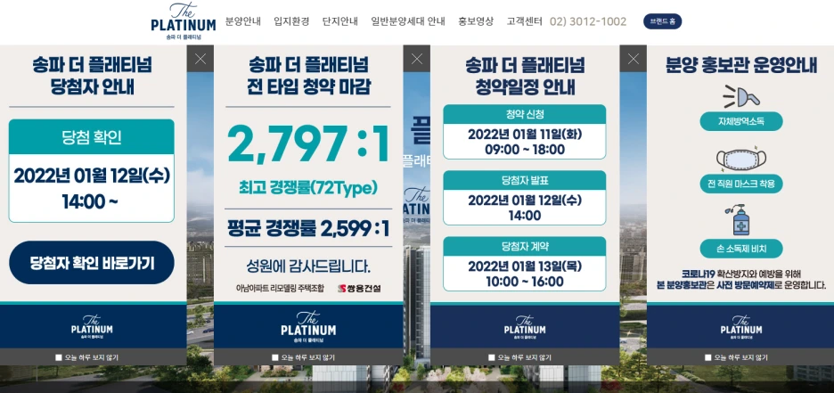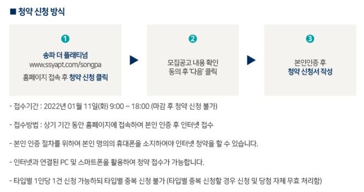바로 앞에 있는 성내천 공원 모습이네요. 뉴스 기사에 조감도 사진에 어떤 분이 송파에 무슨 바다냐고 잘못되었다고 댓글 달아놓은 것을 본 것이 생각나네요, 바다아닌데..ㅎㅎ 인근에 송파도서관과 잠실도 가깝고 걸어서 지하철역도 가능하니 훌륭합니다. 청약신청 방식은 무순위 청약으로 아래 직접 송파 더 플래티넘 홈페이지를 통해서 청약 접수를 진행했습니다. 자금 여력만 된다면 일반 청약에 적용되는 까다로운 조건도 없고, 그야말로 복권 같은 것이기 때문에 분양가 13억 중반에서 14억 후반대의 높은 소형평수 분양가격에도 많은 인원이 몰려들었죠.