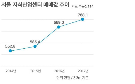 2017년 3분기 서울 내 지식산업센터 평당 매매가는 1년 사이 10% 상승한 768만원을 기록했습니다. 과거 제조업 중심의 지식산업센터는 90% 이상이 실제 입주기업에 의해 분양됐지만, 최근에는 일반 부동산 투자 수요의 비율이 50% 가량 높이 차지하고 있습니다.