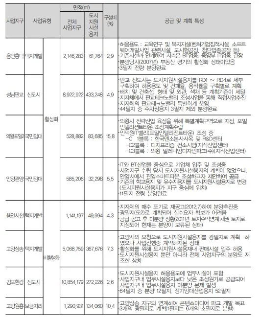 기능적 측면에서도 도시지원시설용지는 지역의 자족성 강화를 목적으로 하고 있지만, 현재 도시지원시설용지에는 도시형 공장 등으로 업종이 제한적으로 허용되고 있어 제기능 수행에도 한계가 드러나고 있다. 뿐만 아니라, 사업마다 도시지원시설용지가 일률적으로 계획되고 지자체간 해당 용지확보에 대한 요구가 점점 증가되면서 공급규모가 비약적으로 증가됨에 따라 과다공급에 따른 미분양 문제도 심각해지고 있어 오히려 지역의 활성화를 저해하는 요인이 되고 있음