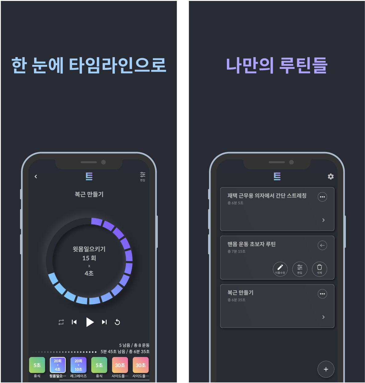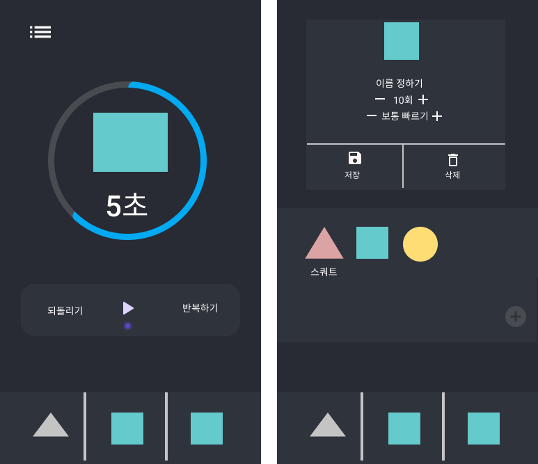 목록 화면에서는 나의 운동 리스트를 저장하고 관리할 수 있다. 카드의 왼쪽 상단 버튼을 누르면 화려한 애니메이션과 함께 이름 수정, 편집 기능이 있다. 재생 화면에서는 운동 루틴을 마치 타임라인처럼 재생할 수 있다. 아래쪽 타임라인이 움직이고 어플에서 재생되는 타임라인에 맞게 개수를 세어주면 난 소리에 맞춰 몸뚱이를 움직여주기만 하면 된다.
