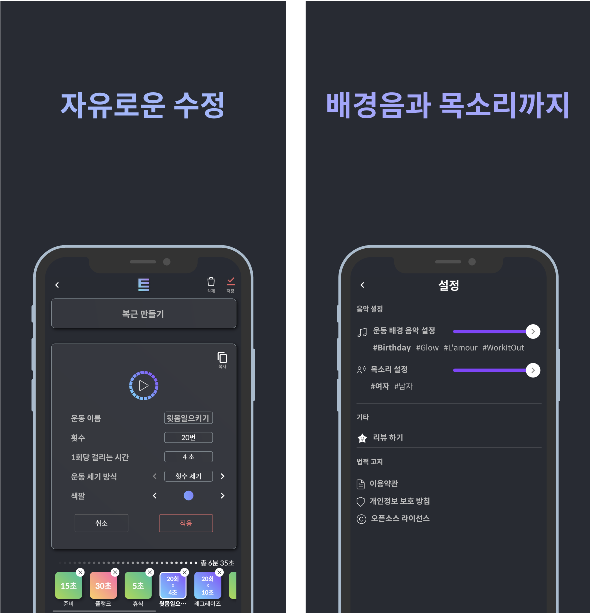 편집 화면에서는 운동을 만들고, 만들어진 운동 블록을 드래그하여 타임라인을 편집할 수 있다. 운동 옵션에는 횟수, 시간 세어주는 방식, 이름을 따로 설정할 수 있다. 이 정도만 해도 웬만한 운동 루틴은 불편함 없이 전부 만들 수 있다. 설정 화면에서는 목소리와 배경 음악을 바꾸고 볼륨 조절도 할 수 있도록 했다. 목소리는 아직 기계음이지만 조만간에 전문 성우를 고용해서 더 힘나는 목소리로 바꿔 볼 수도 있을 것 같다.