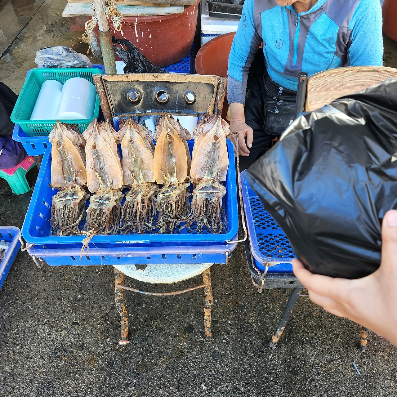 마른오징어와 피데기도 사고 싶어서 두리번거리니, 횟감을 파신 할머니가 "피데기를 살 거면 내일 가지고 나오겠다. 난 새벽 4시부터는 나와 있을 것이다."셔서 울릉도식 당근 약속을 잡았다. 피데기는 해결되었으니 옆 할머니에게서 마른오징어도 샀다.