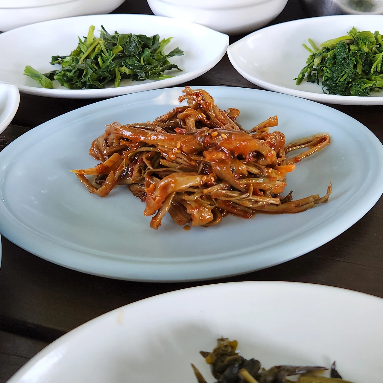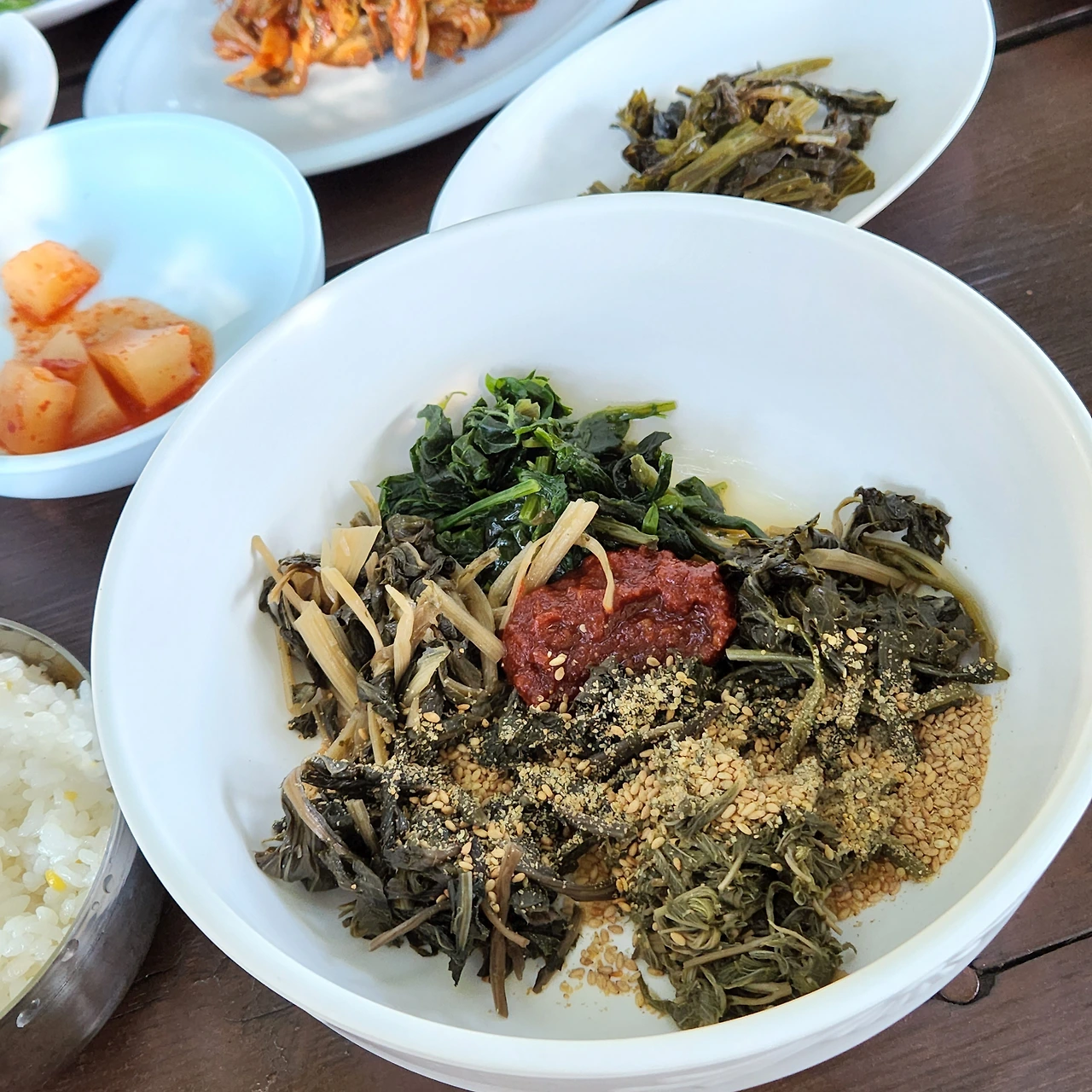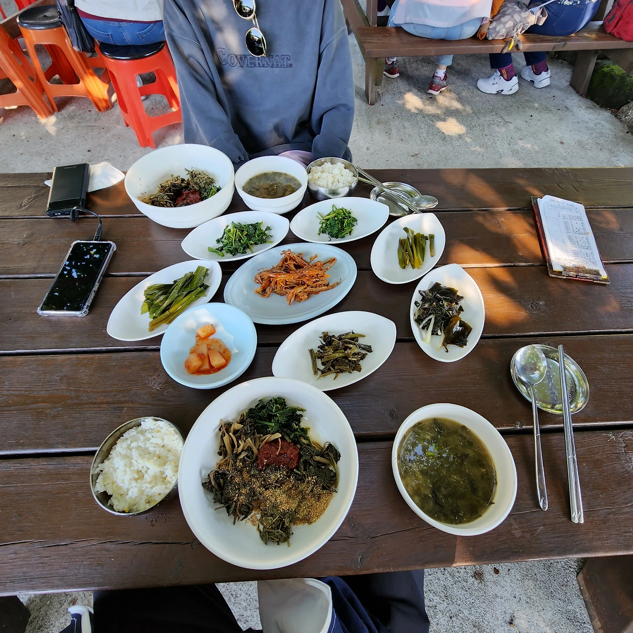 그 후엔 모든 관광객들이 가는 <나리촌식당>에서 산채비빔밥을 먹었다. 울릉도의 산나물들을 넣은 귀한 밥상이다. 명이나물, 부지깽이나물, 취나물 등 처음 맛보는 나물들도 많다. 울릉도 음식에는 늘 깨 땅콩가루 같은 게 올라가 자극적이지 않으면서 약간 텁텁한 느낌이다.