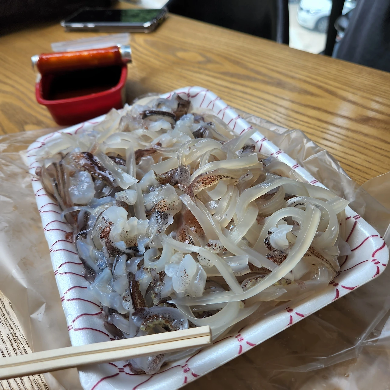 다시 저동항으로 돌아왔더니 점심시간. 어젯밤 오징어잡이 배들이 환하게 넘실거리더니 만선이로구나. 제일약국 앞에 오징어 장이 열렸다. 여행 첫날과 이다음 날도 오징어가 잡히지 않았는지 장이 열리지 않았었는데. 오징어 회는 1만 원어치만 먹어도 충분했지만, 어디 한번 배 부르게 먹어보자라는 마음으로 2만 원어치 (4마리)를 주문했다.