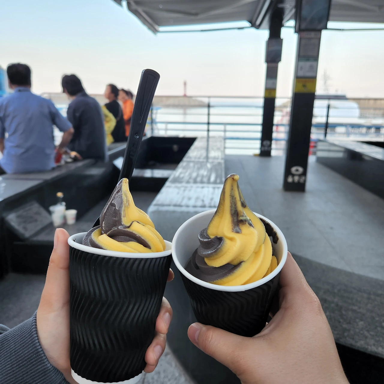 다시 숙소가 있는 저동항으로 돌아와서 <저동 커피>에서 먹물과 호박 아이스크림 겟. 생각 외로 입에 잘 맞아서 흡입했다. 너무 귀여운 울릉도·독도 마그넷도 하나 장만하고.