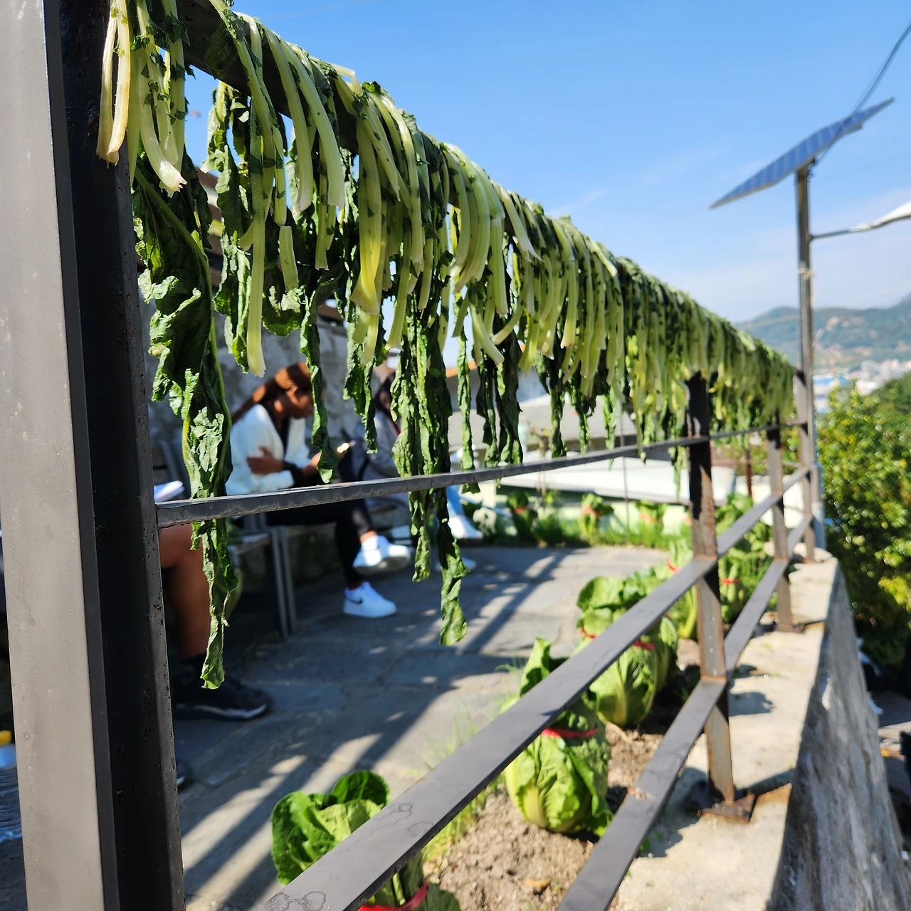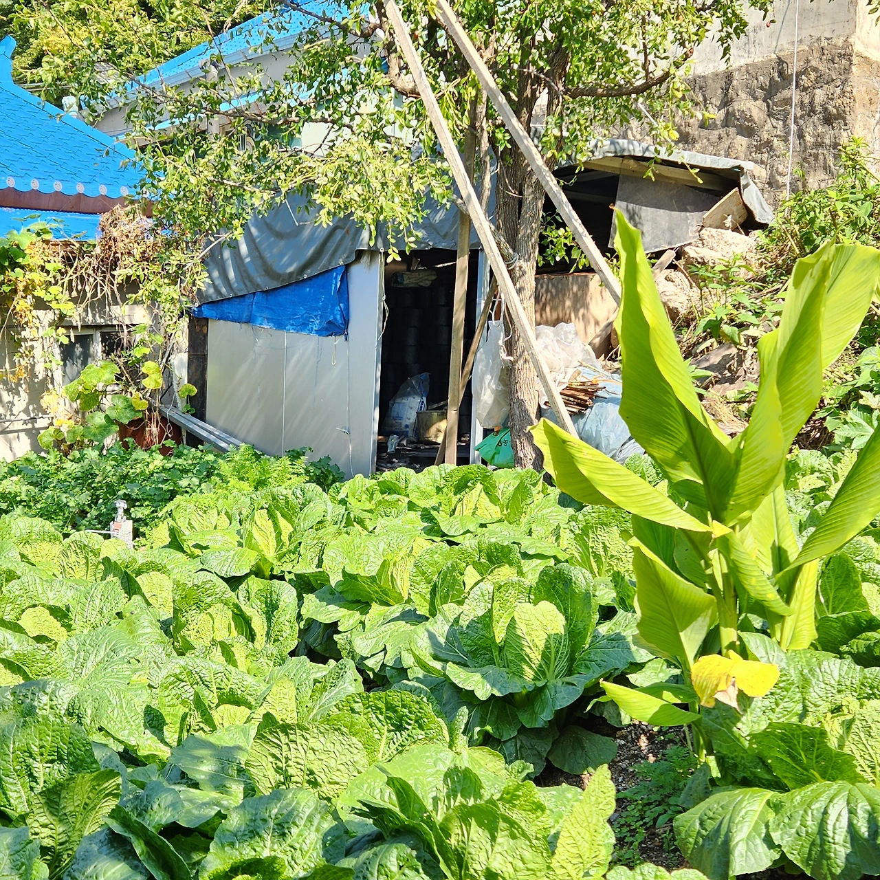 풍성하게 자란 배추들, 그리고 그 너머 보이는 쌓아놓은 연탄들. 수도와 전기공급이 된 지도 얼마 되지 않았다고 한다. 도시가스도 들어오지 않아 아직도 연탄을 쓴다고. 버스 정류장 종점에 있는 공중화장실도 주민들을 위한 곳이라고 들었다.
