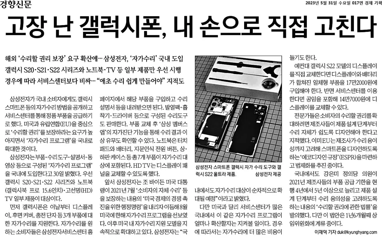 국내는 A/S센터가 워낙 잘 되어있지만 '셀프 수리 프로그램'이나 '수리할 권리'는 다른 차원으로 접근하는 게 맞다.