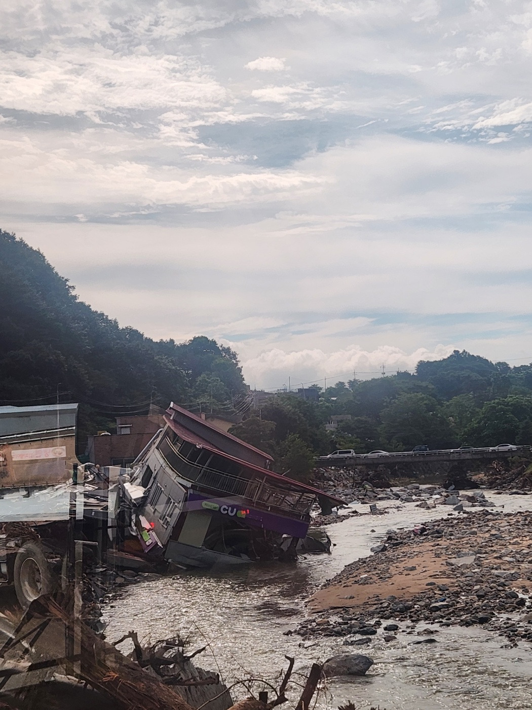 이른 아침 버스를 타고 현장으로 갔다. 조종면 CU매장은 지반이 무너진 처참한 모습으로 우리를 기다리고 있었다. 호우로 도로가 무너져 마을회관까지 진입이 어려워 굽이굽이 돌아가야 했다. 조속한 복구를 해야 한다고 입으로 읊는 것과 현장을 대면하는 것은 완전히 다른 분야였다. 장화, 팔토시, 삽 등을 트럭으로 주문하는 일부터 이장님의 행정력에 기대어 업무를 배분받는 일, 400여 명의 봉사자가 단전된 마을회관 화장실 한 칸을 나누어 사용하는 일까지.