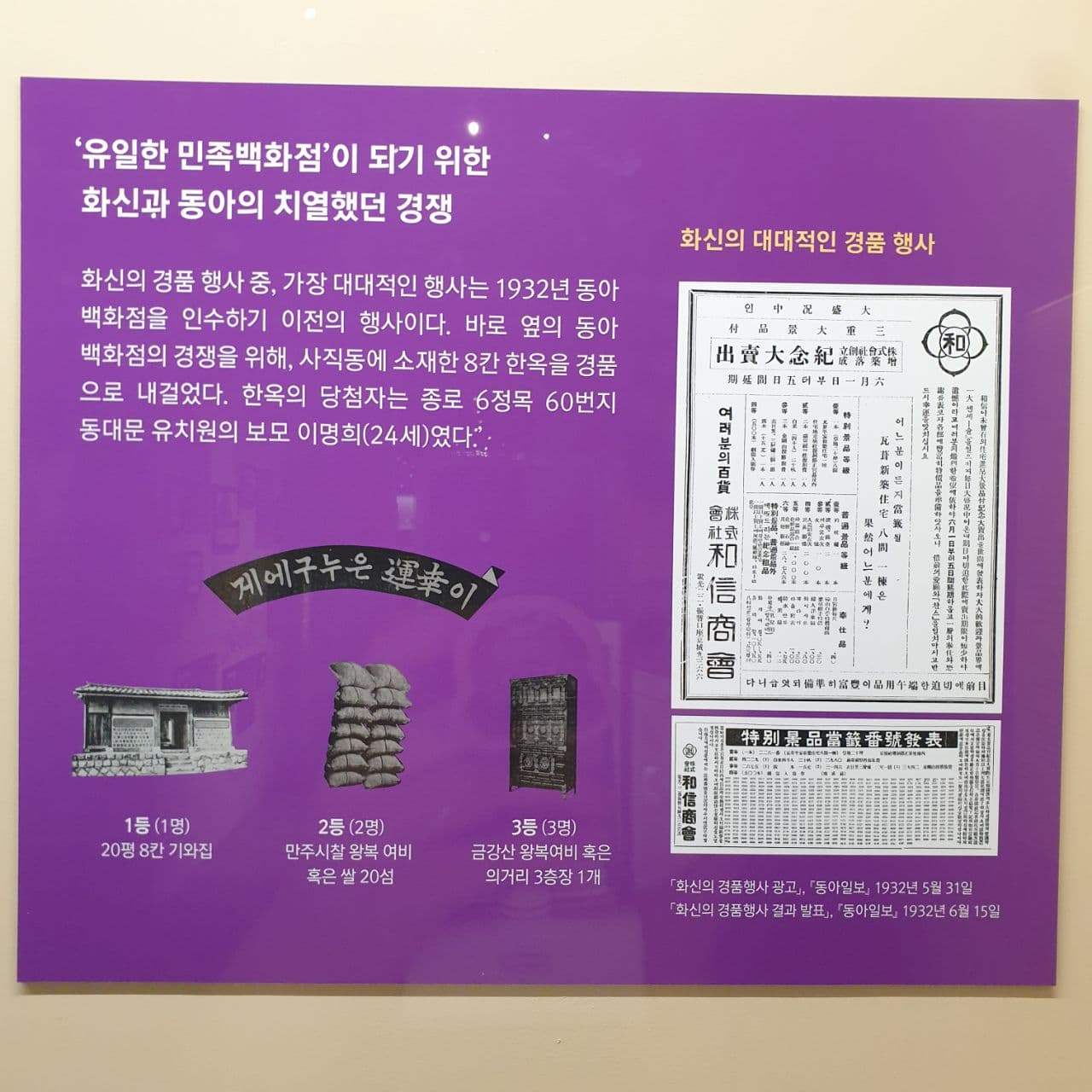 역시 우리 민족은 호쾌한 민족이다. 화신백화점에서 경품으로 종로 기와집 한 채를 걸었다니! 지금 백화점 개점 기념으로 '한남 더 힐' 한 채쯤 걸은 것이 아닌가.
