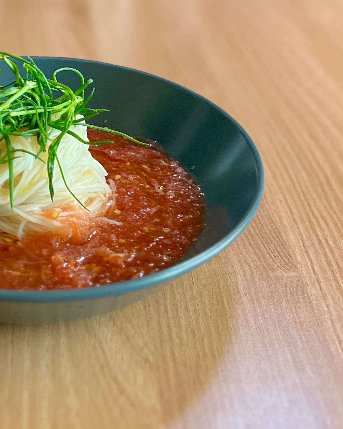 소면 1인분, 올리브오일, (국물) 토마토 2개, 다진 마늘 1t, 국수장국 3t, 간장 1t, 미림 1t, 레몬주스 1t, 매실액 1t, 소금 한 꼬집