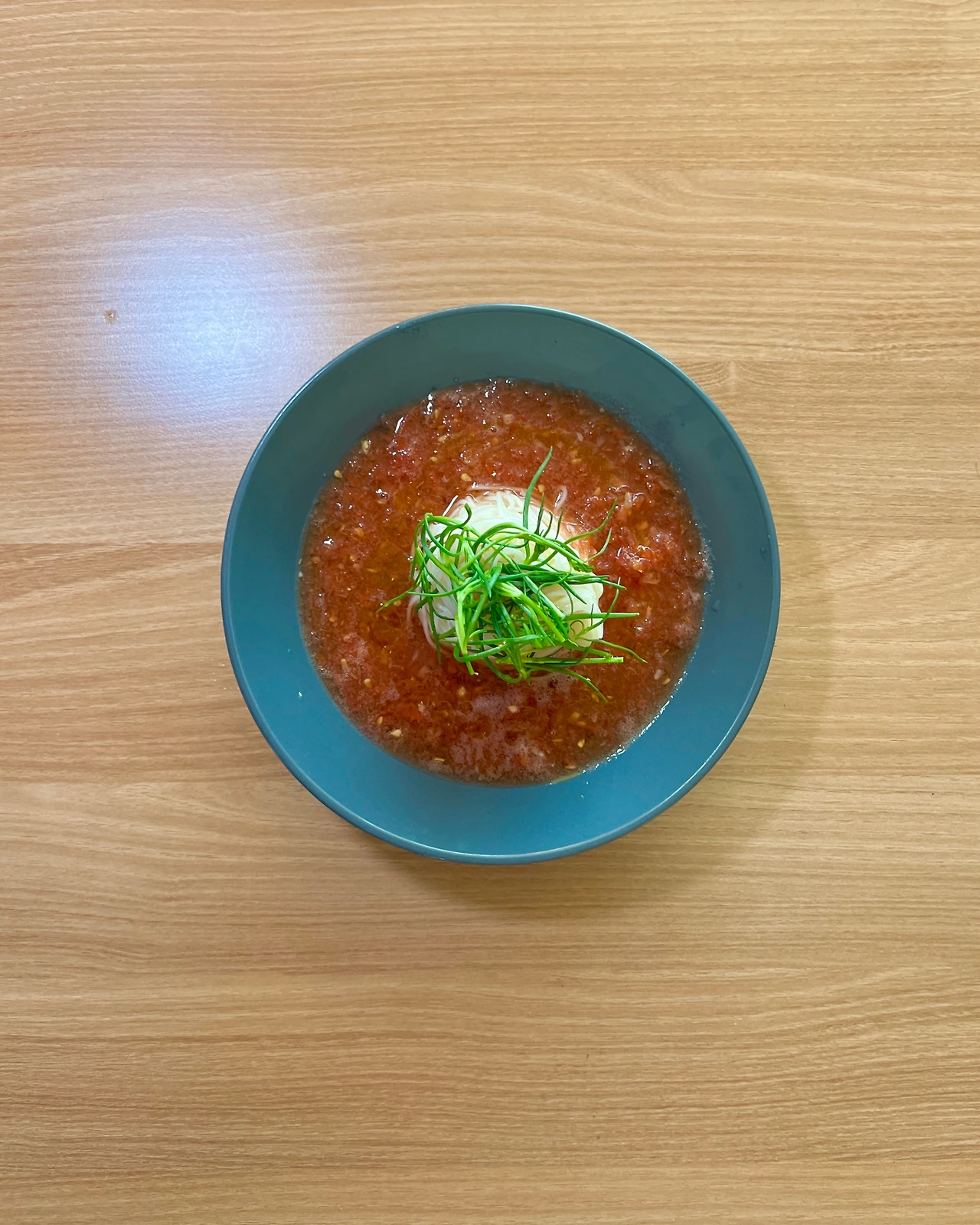 1. 토마토를 깨끗하게 씻은 뒤 구멍이 큰 그레이터에 간다. (감자 채칼 정도면 적당하다.) 여기까지는 어제 조식, Pan con tomate와 같다. 다진 마늘 1t, 국수장국 2t, 간장 1t, 미림 1t, 레몬주스 1t, 매실액 1t 넣어 국물을 만든다. 소금 한 꼬집 넣는다.
