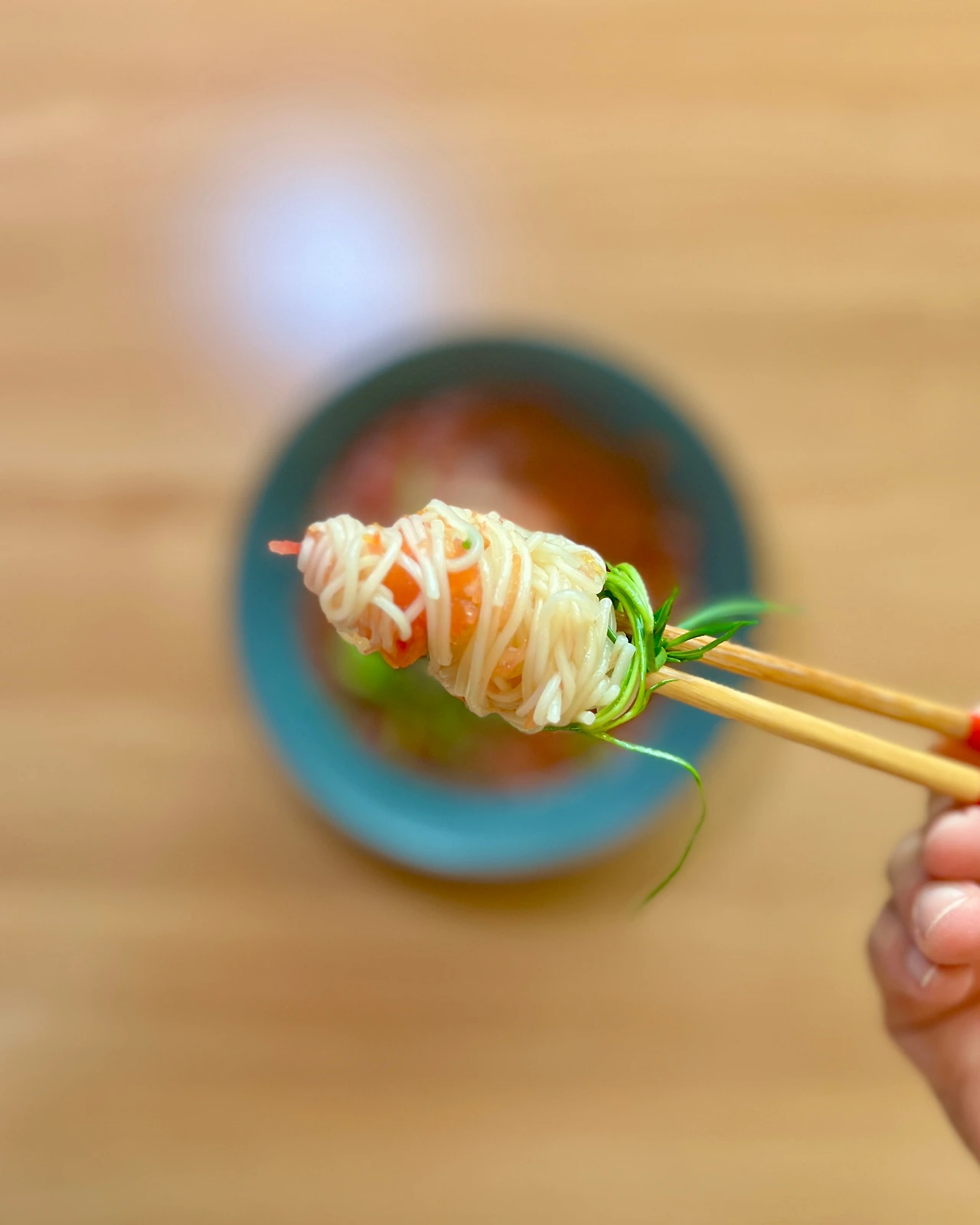 토마토를 끓는 물에 데치고 껍질을 벗겨서 사용하면 좋겠지만 시간이 없으므로 그냥 갈고 감칠맛을 내줄 다시마물 대신에 국수장국을 넣었다. 덕분에 예전에 만든 #토마토냉국수 보다 훨씬 간편하게 만들 수 있는 약 463kcal #토마토소면