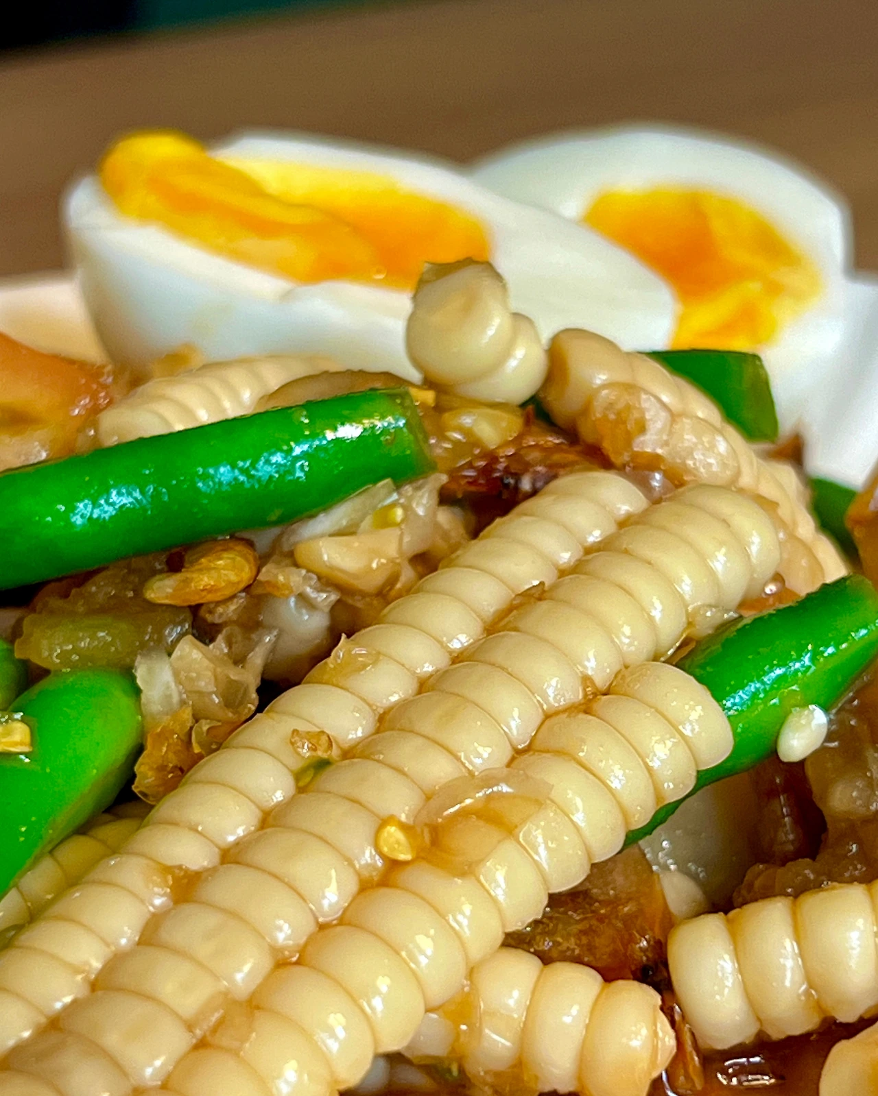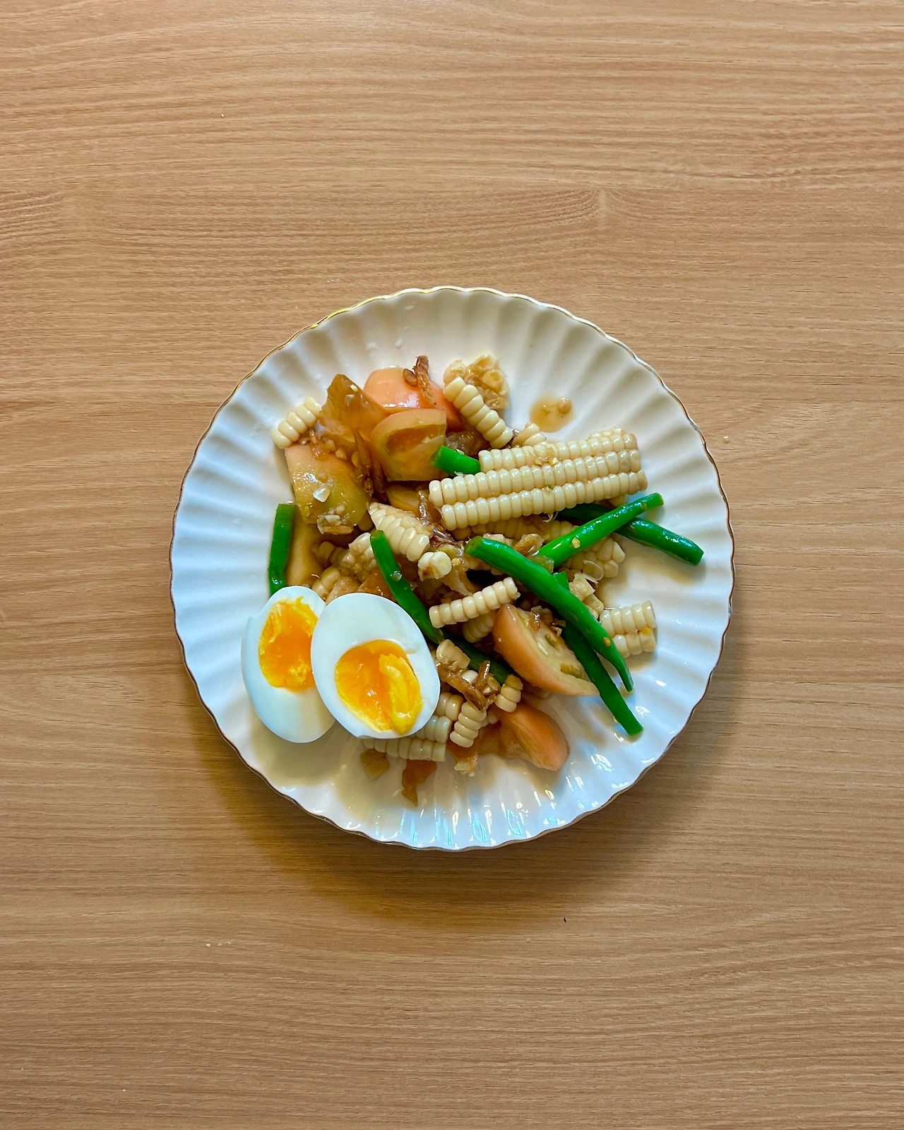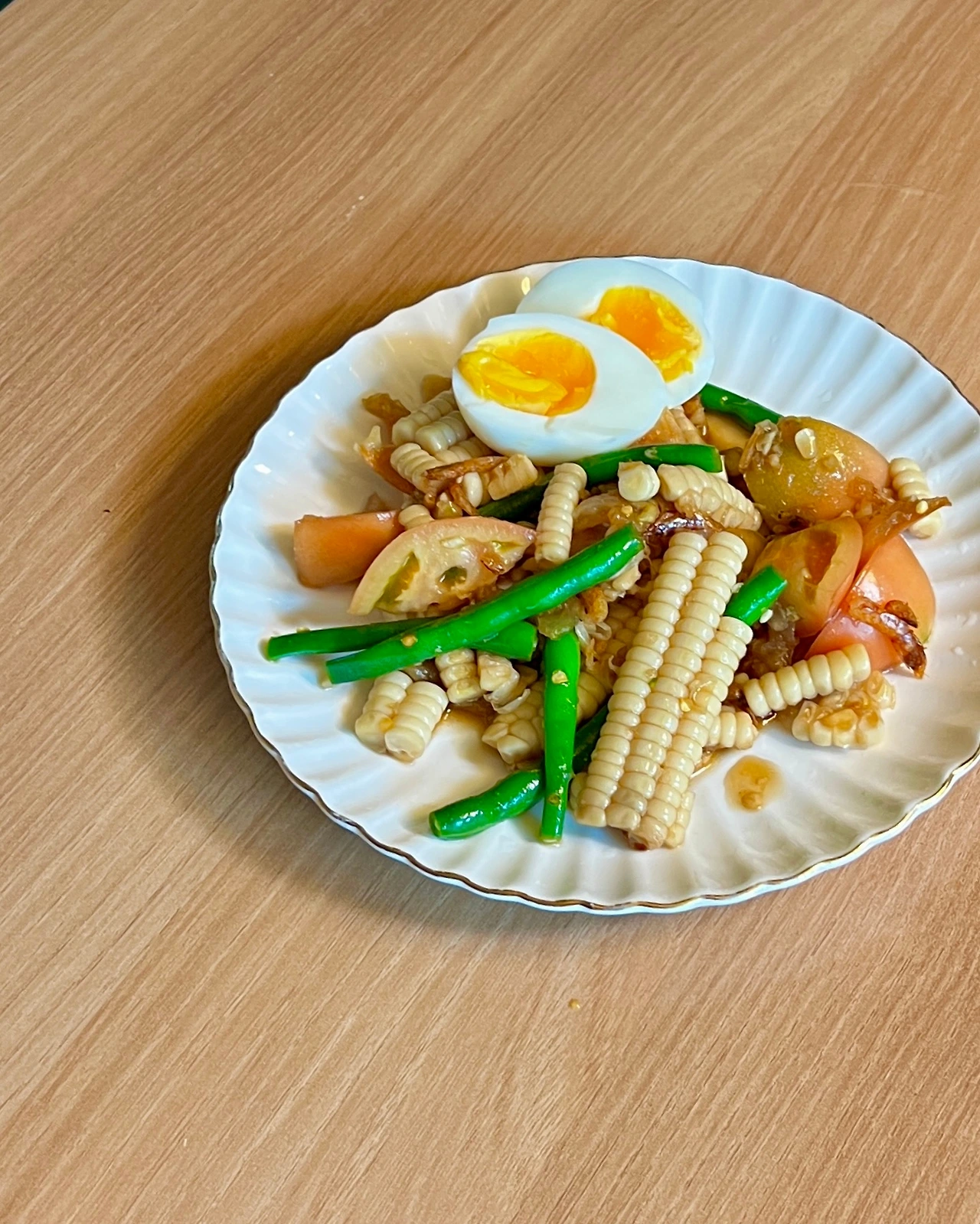 옥수수 1개, 그린빈 3~4개, 작은 토마토 1~2개, 계란 1개, 다진 땅콩 1t, (드레싱이라고 하긴 어렵지만,) 마늘 2개, 페페론치노 2~3개, 피시소스 1t, 라임주스 1T, 코코넛슈가 1T, 토마토 3~4조각, 말린 새우 1T