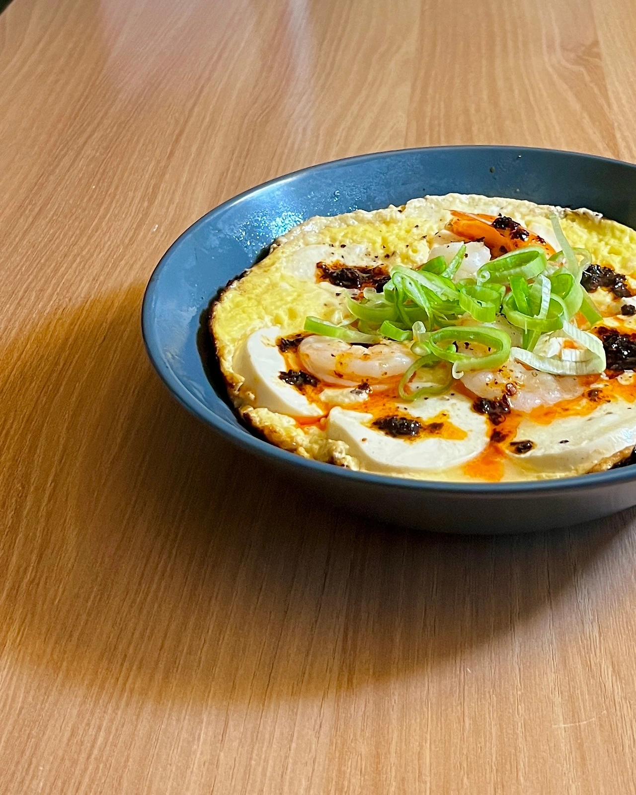 1. 팬에 순두부 1개 얹은 다음 숭덩숭덩 자른 후 계란 2개 풀어서 붓는다. 새우 얹고 익을 때까지 뚜껑 닫고 잠시 기다린다.
