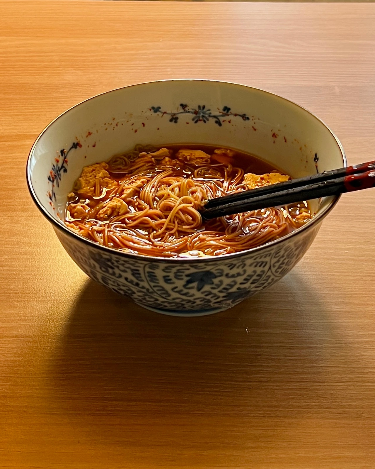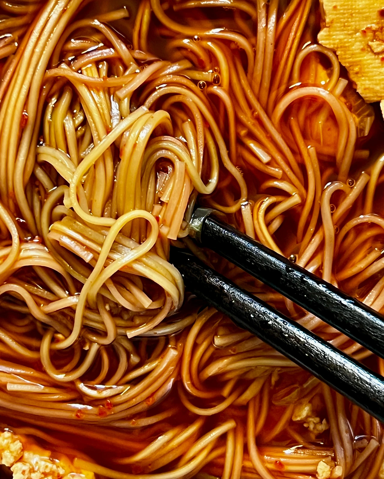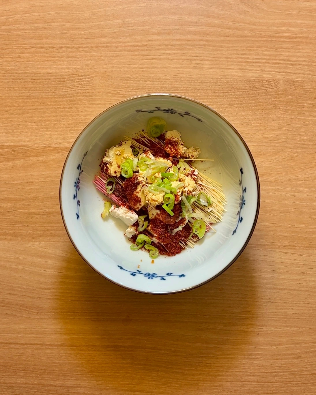 소면 1인분, 으깬 두부 2T, 고춧가루 1t, 쯔유 1T, 액젓 2T, 대파 1T, 참기름 1t 그리고 물은 2컵 반 만,