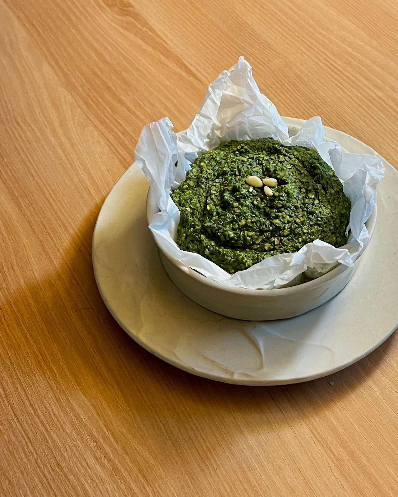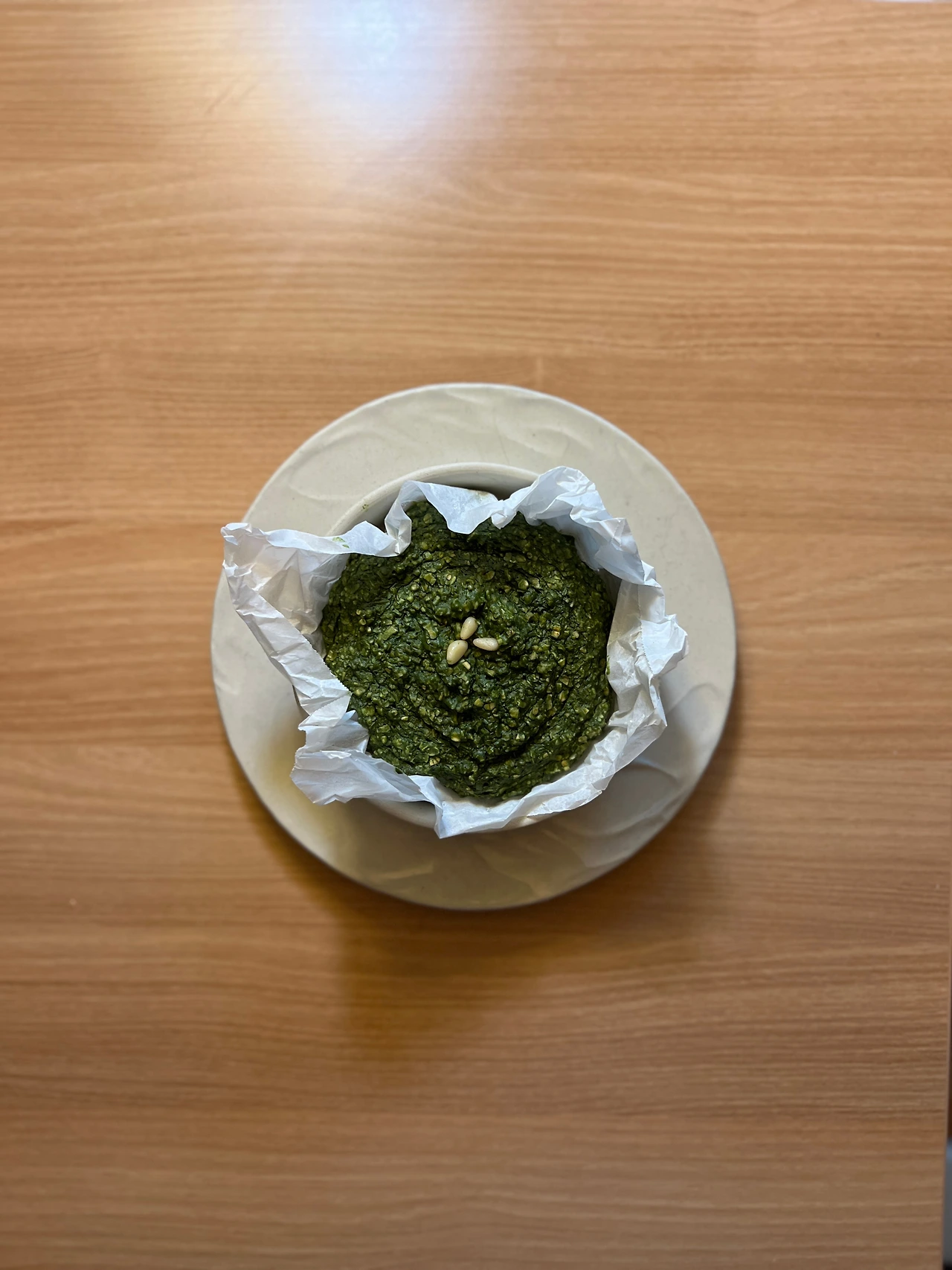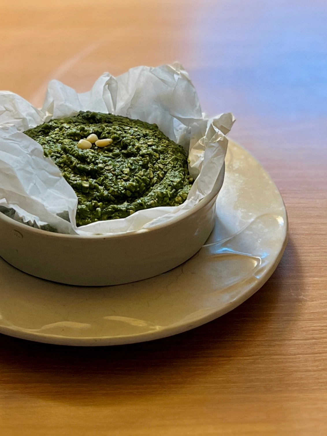 오트밀 90g, 베이킹파우더 2g, 말차 1T, 계란 1개, 순두부 150g, 알룰로스 20ml와 잣