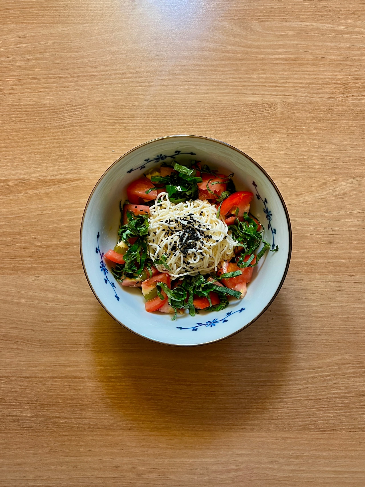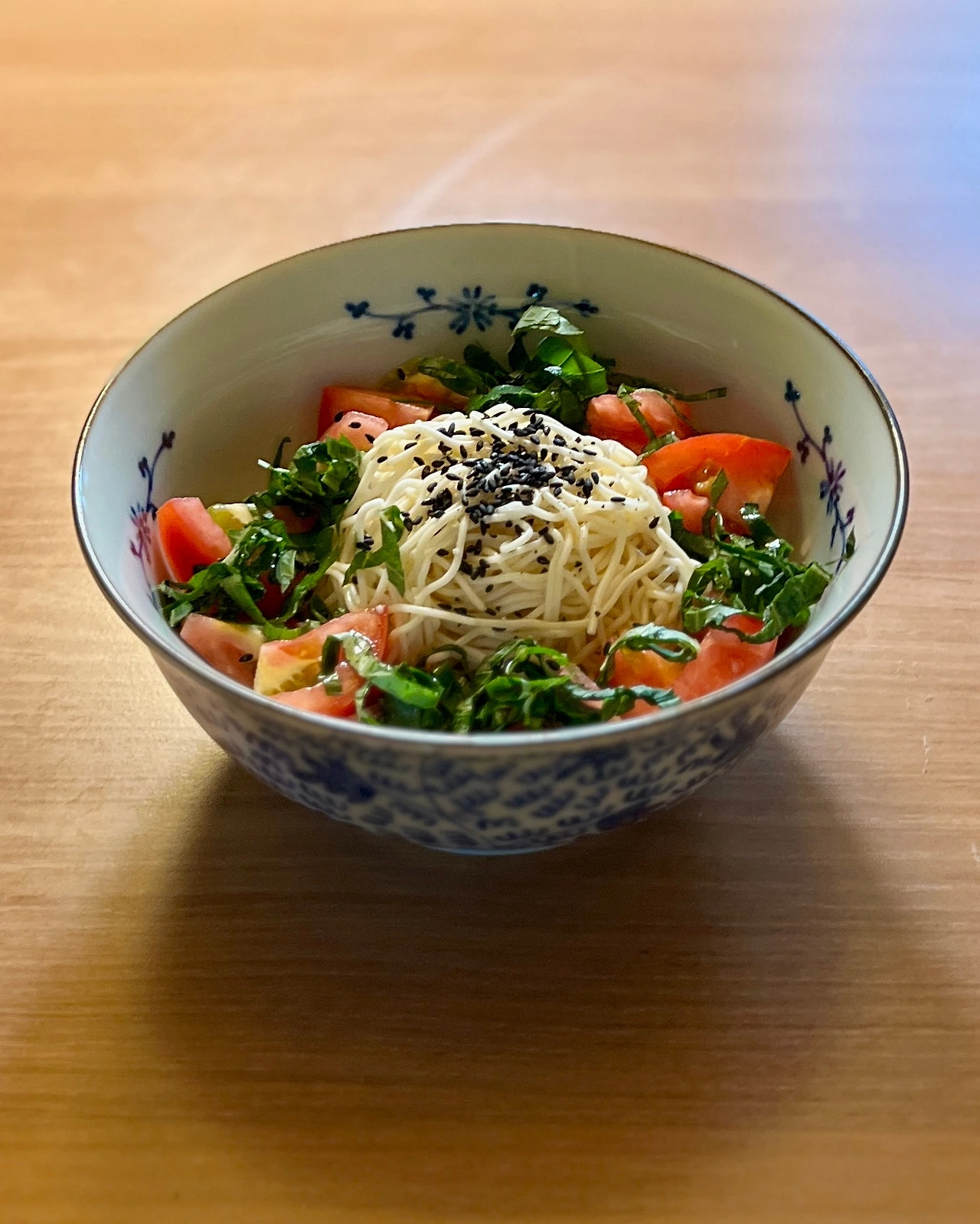 두유면 1개, 깻잎 10장, 토마토 1개, (드레싱) 쯔유 5T, 들기름 1T, 화이트와인 비니거 3T, 물 7T(물은 간을 보고 취향대로)