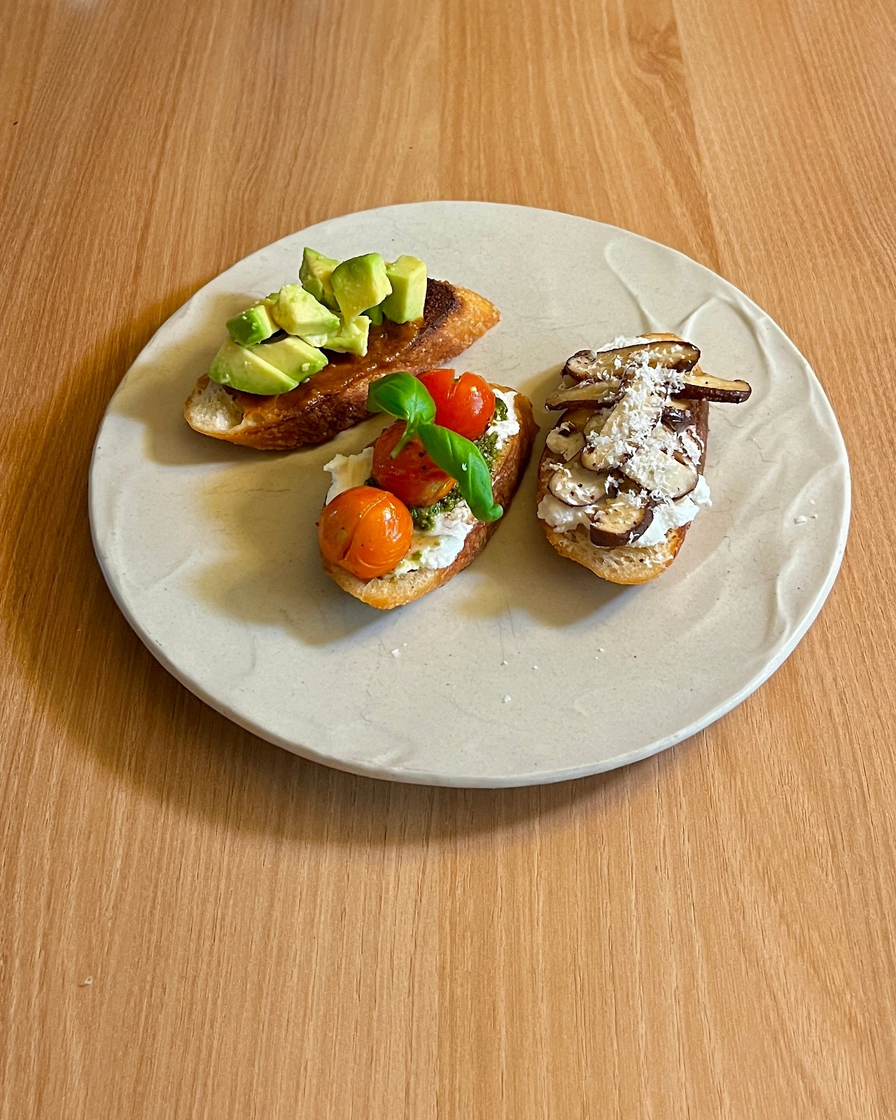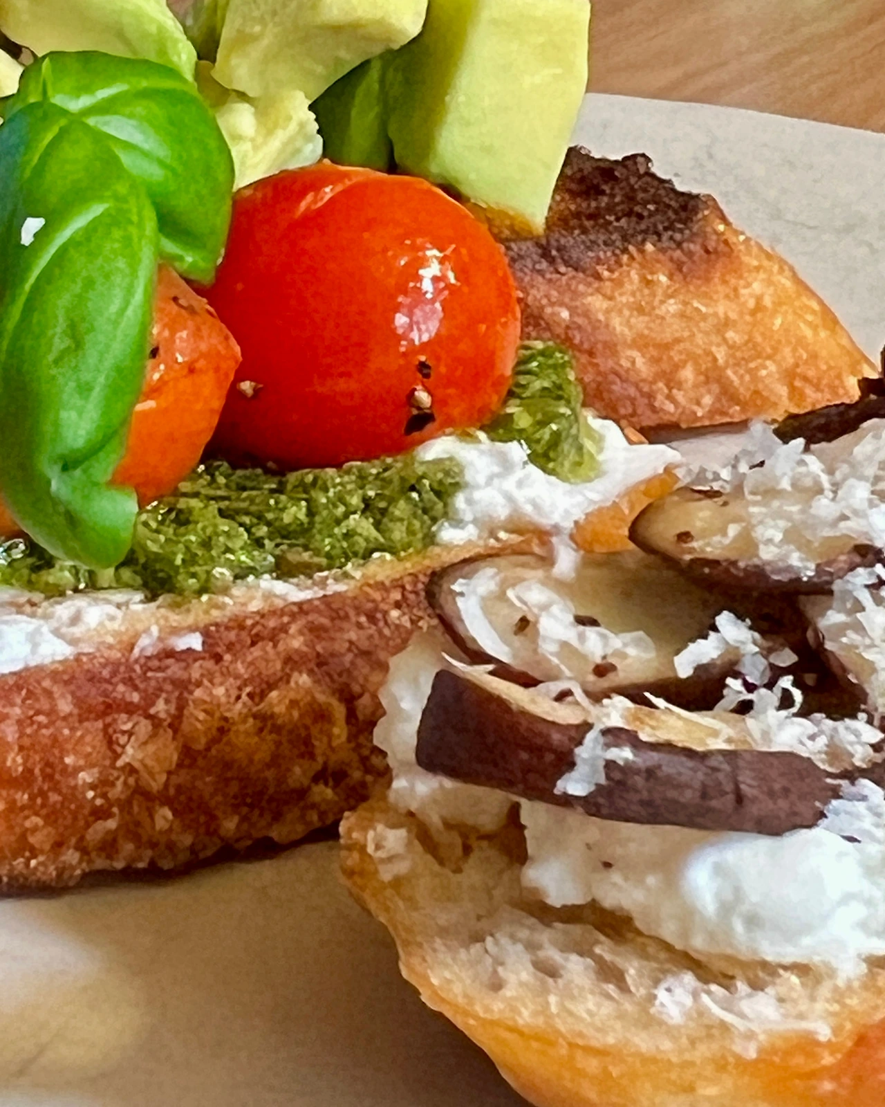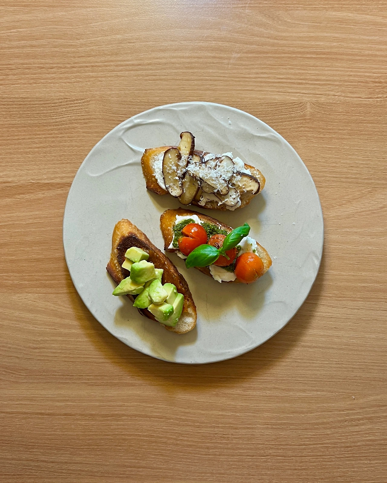 바게트 1/2개, (1번) 살사소스 1T, 아보카도 1/2개, 후추와 말돈소금, (2번) 레몬주스와 올리브오일 1t, 리코타치즈 2T, 바질페스토 1T, 방울토마토 3개, 올리브오일, 소금, 후추, 바질, (3번) 2번의 휘핑한 리코타치즈, 표고버섯 1개, 후추, 파마산치즈