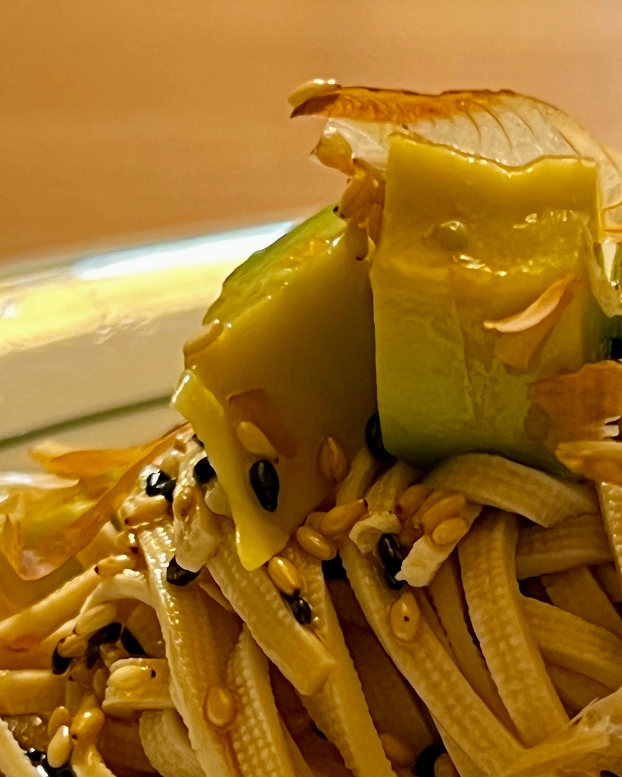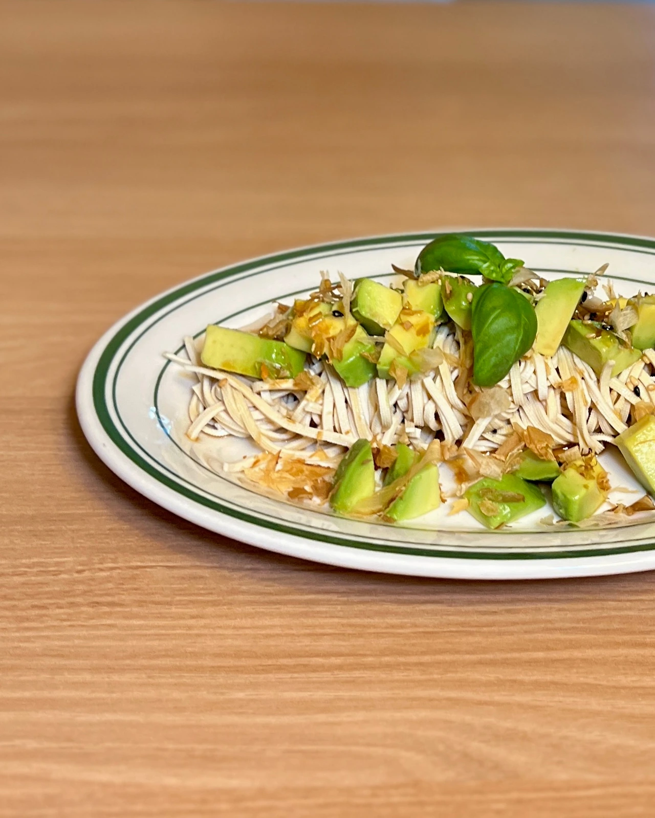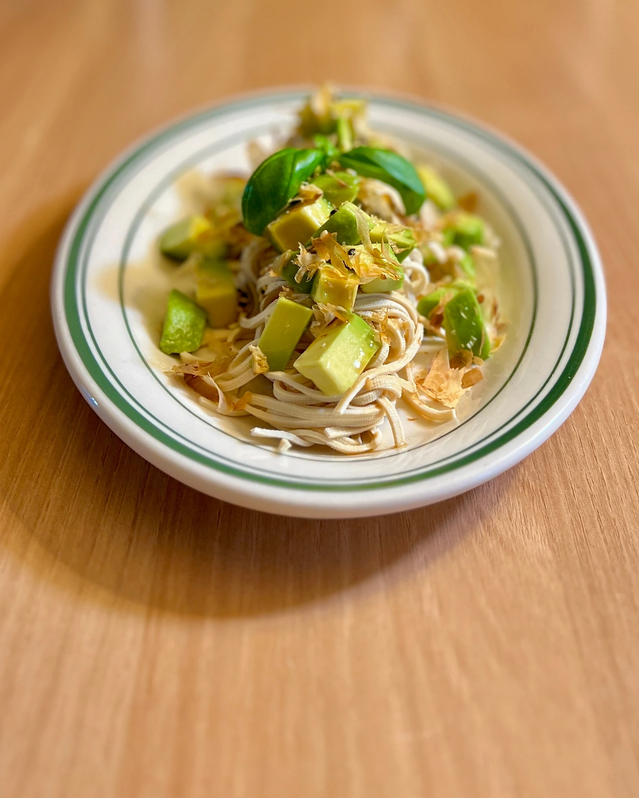 4. 접시에 두부면 담고 아보카도와 가쓰오부시 얹고 3의 드레싱 뿌린다.