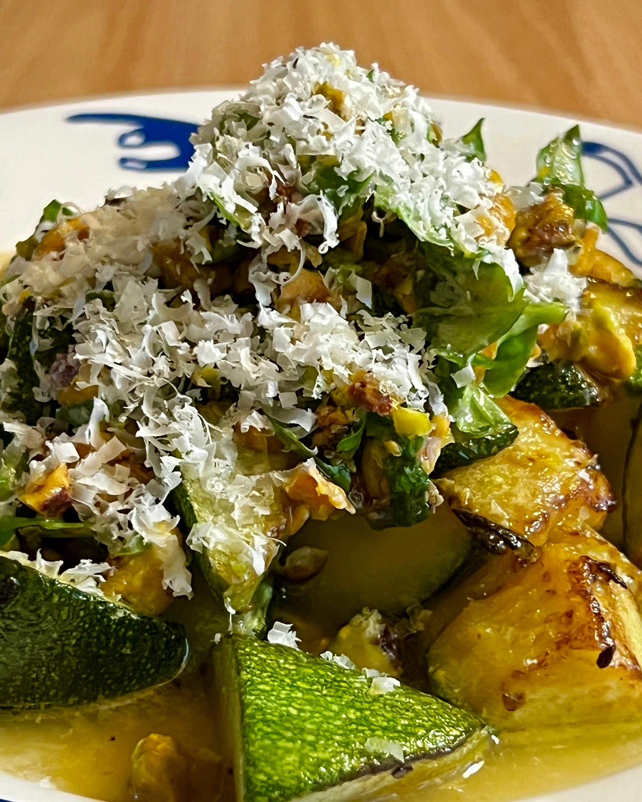 주키니 1/2개, 다진 마늘 1개, 파마산 치즈, (드레싱) 올리브오일 2, 꿀 1/2, 다진 피스타치오 1/4컵, 다진 바질 1/4컵, 레몬 1개 분량의 제스트와 주스, 소금 한 꼬집, 크래시드 페터 한 꼬집