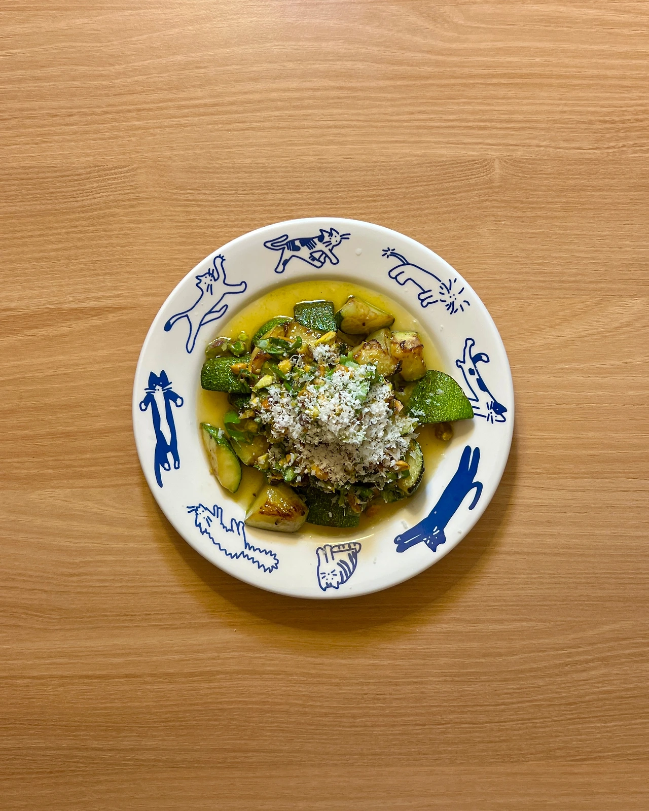 4. 구운 주키니를 접시에 담고 2의 드레싱 붓고 파마산 치즈 얹는다.