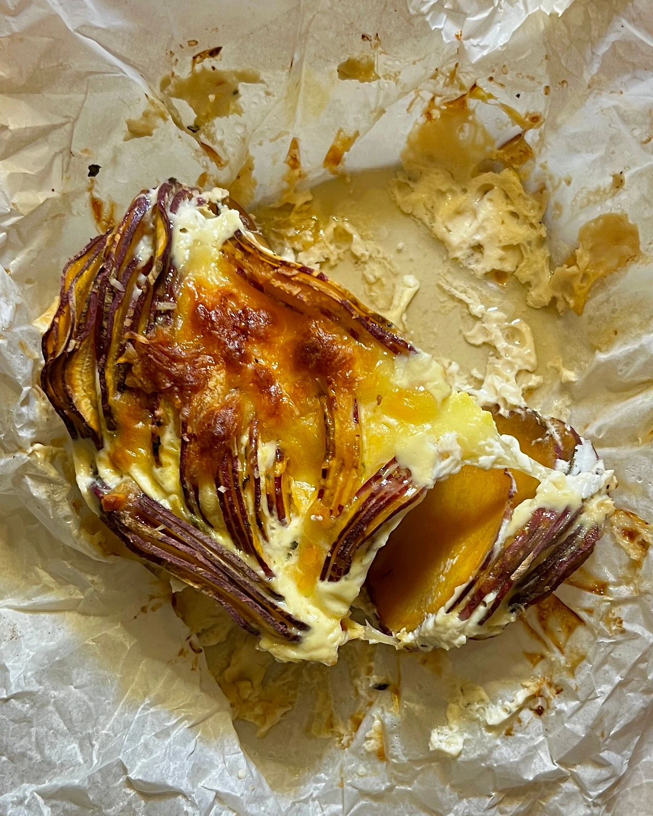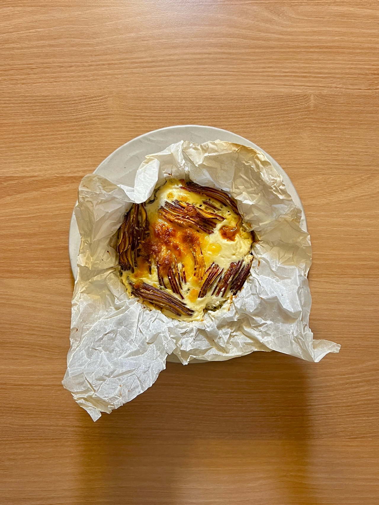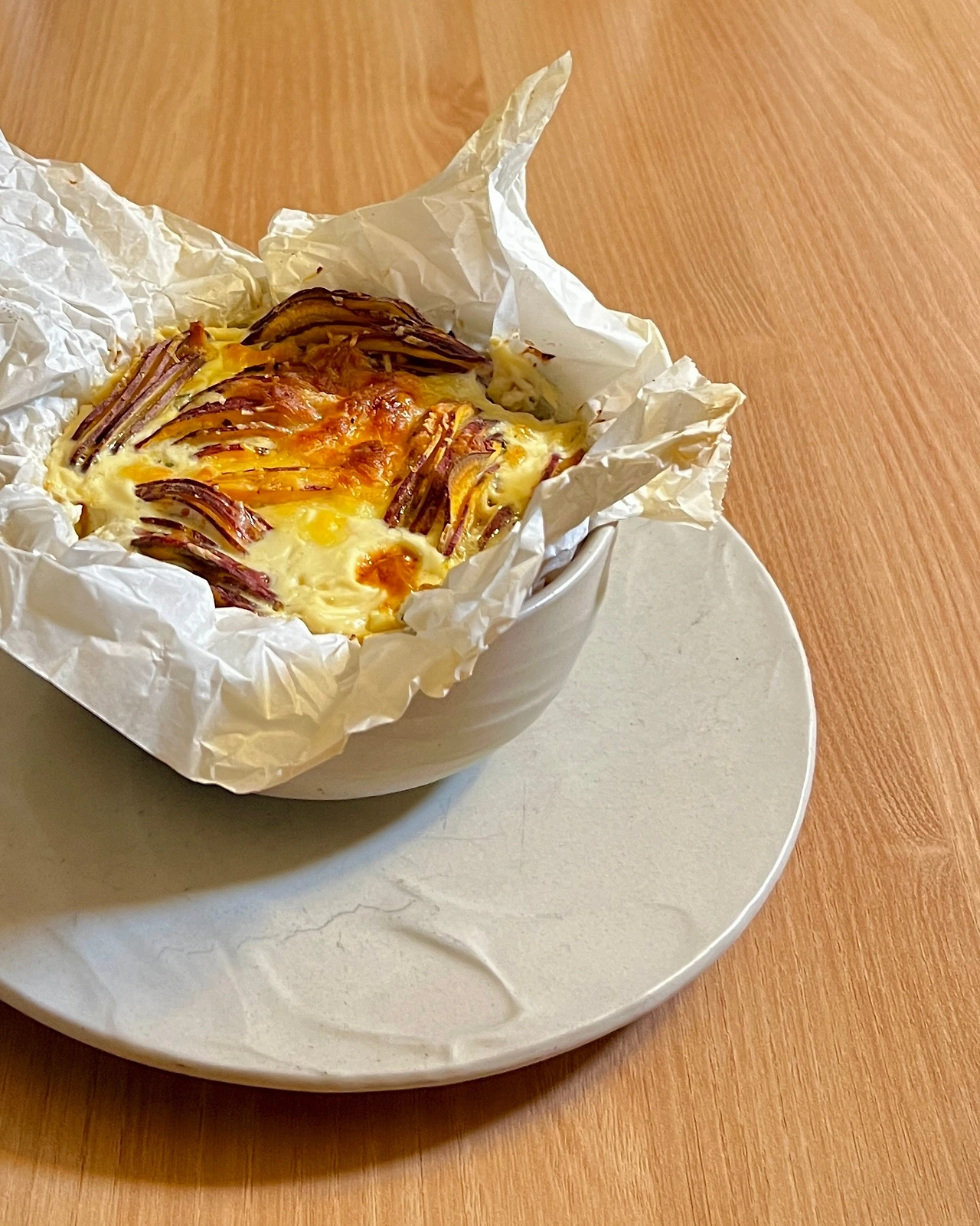 감자, 고구마 같은 구황작물을 활용한 그라탱은 보통 그릇에 가로로 차곡차곡 담아서 만든다. 오늘은 채칼로 썬 단면이 보이도록 세로로 담았더니 왠지 좀 더 근사해 보인다. 675kcal #고구마그라탱