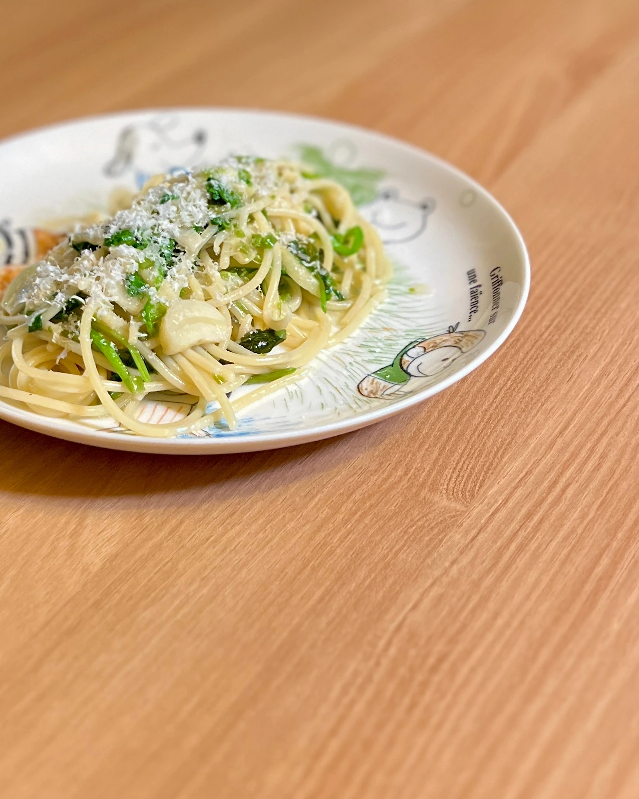 4. 접시에 가지런히 파스타 담고 파마산치즈 얹는다.