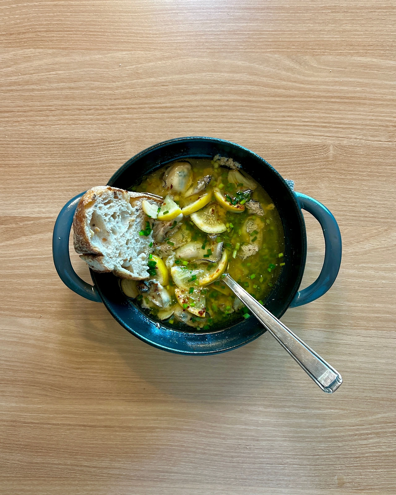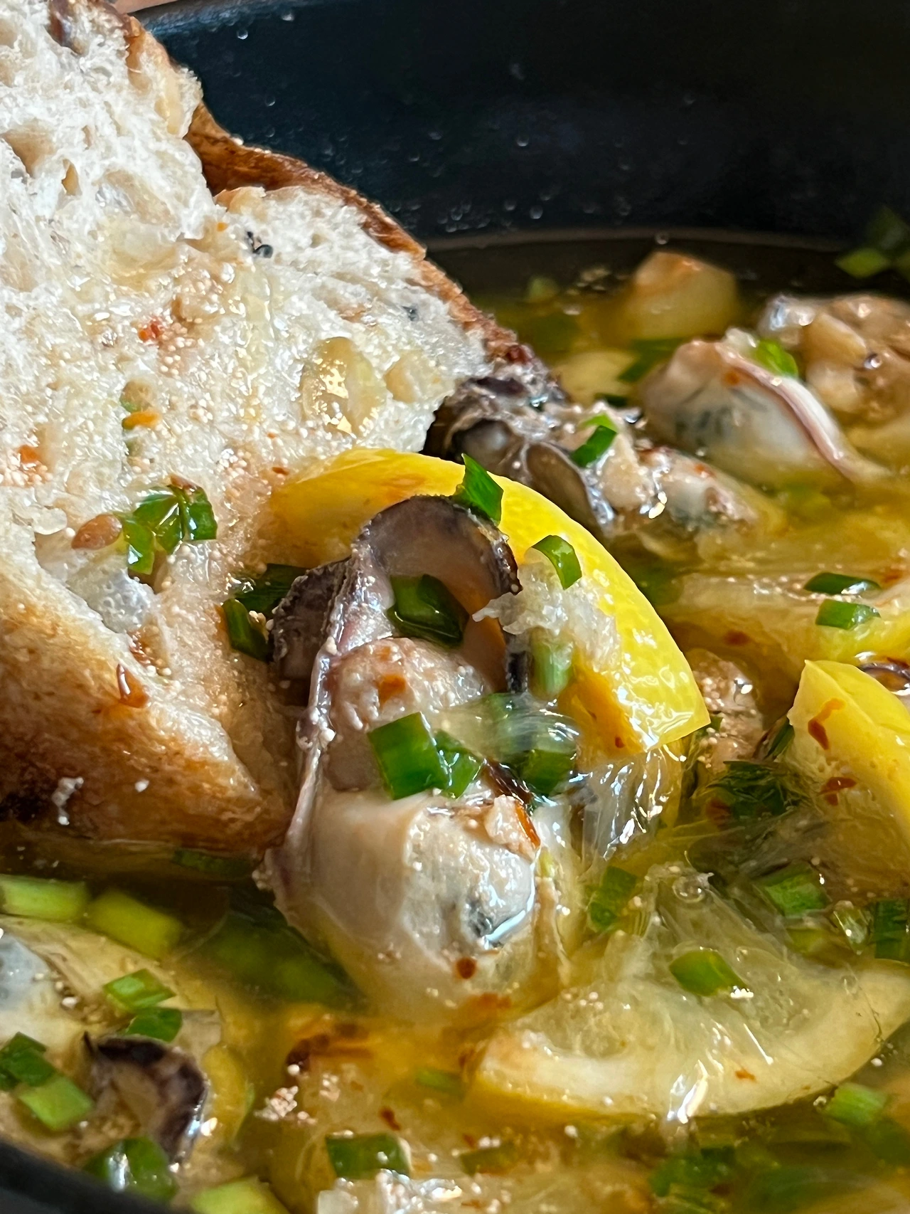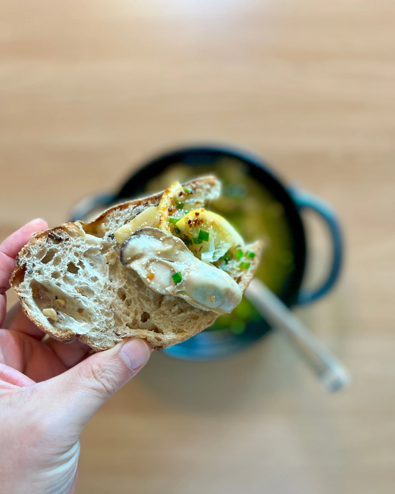 사워도우 1개, 굴 200g, 올리브오일, 레몬 1/2개, 마늘 10개, 명란 1T, 버터 1/2T, 후추, 크래시드 페퍼, 부추 조금