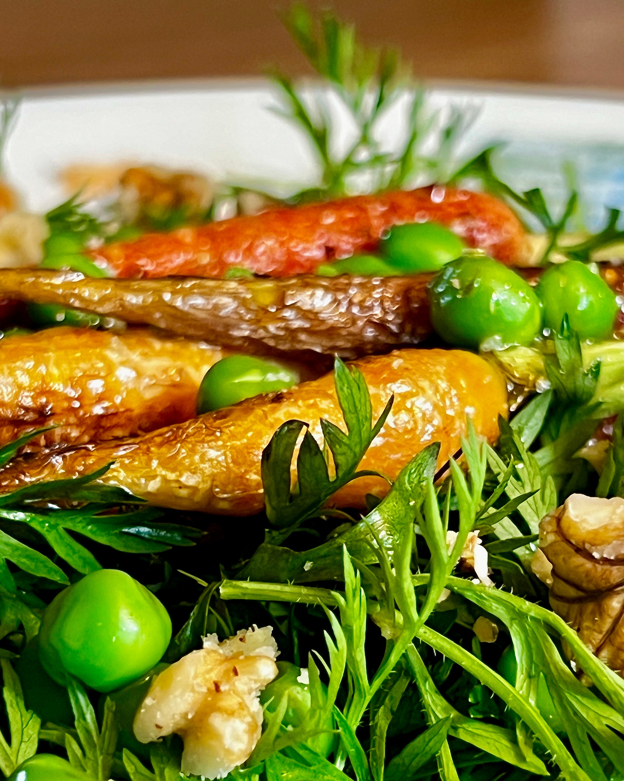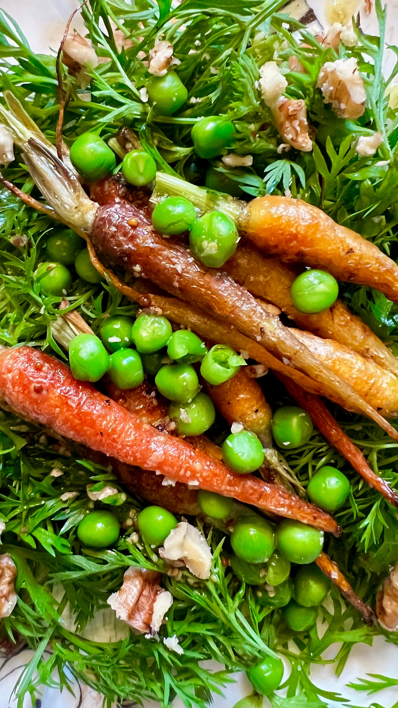 잎이 달린 당근 5~6개, 완두콩 1/2컵, 소금, 후추, 올리브오일, (드레싱) 올리브오일 2T, 화이트와인 비니거 1T, 홀그레인 머스터드 1t