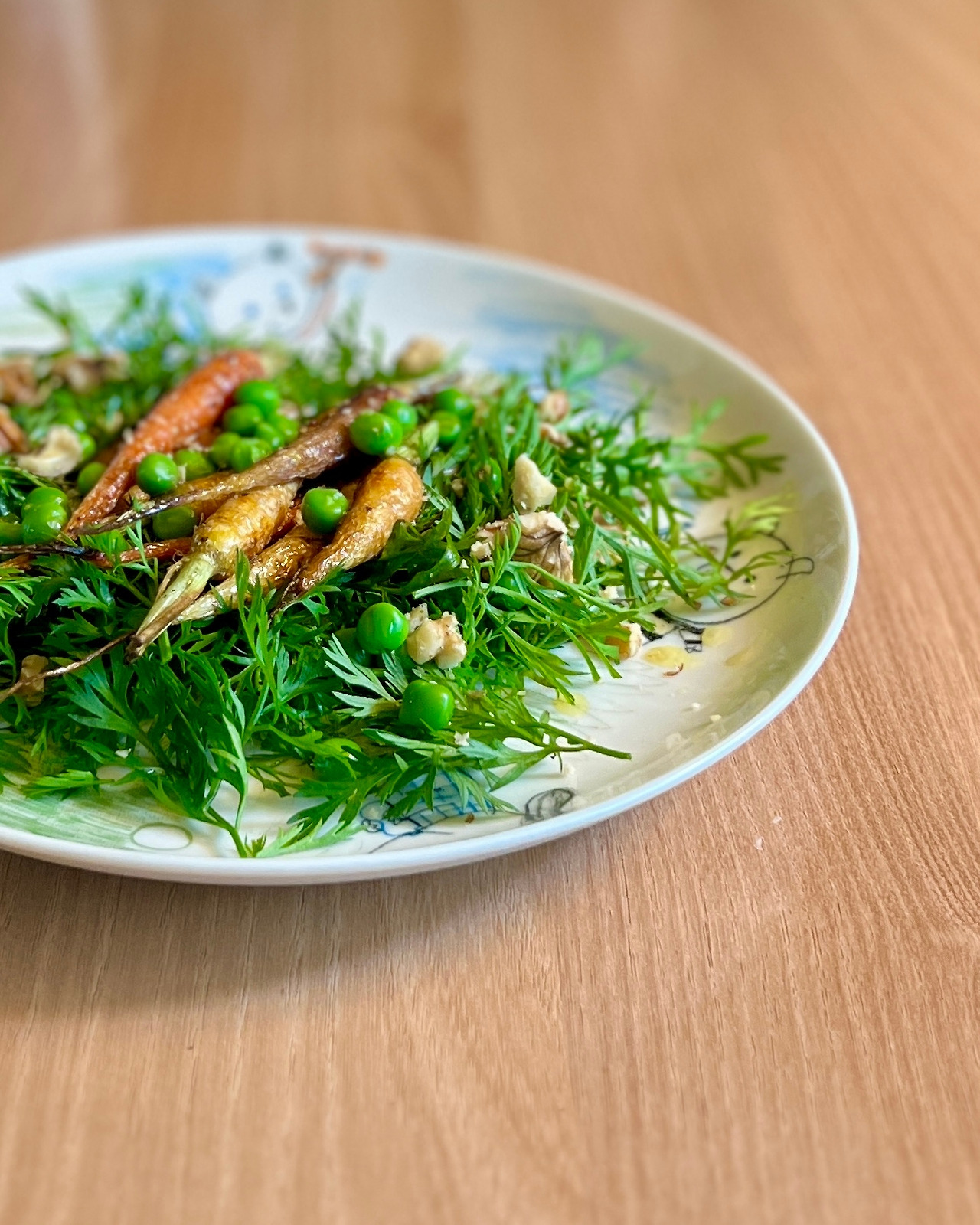 4. 접시에 잎을 소복하게 담고 3의 당근 얹고 완두콩 얹고 드레싱으로 마무리한다.