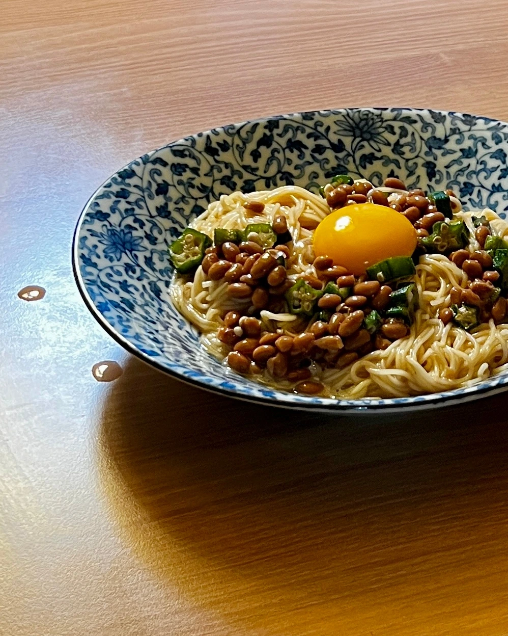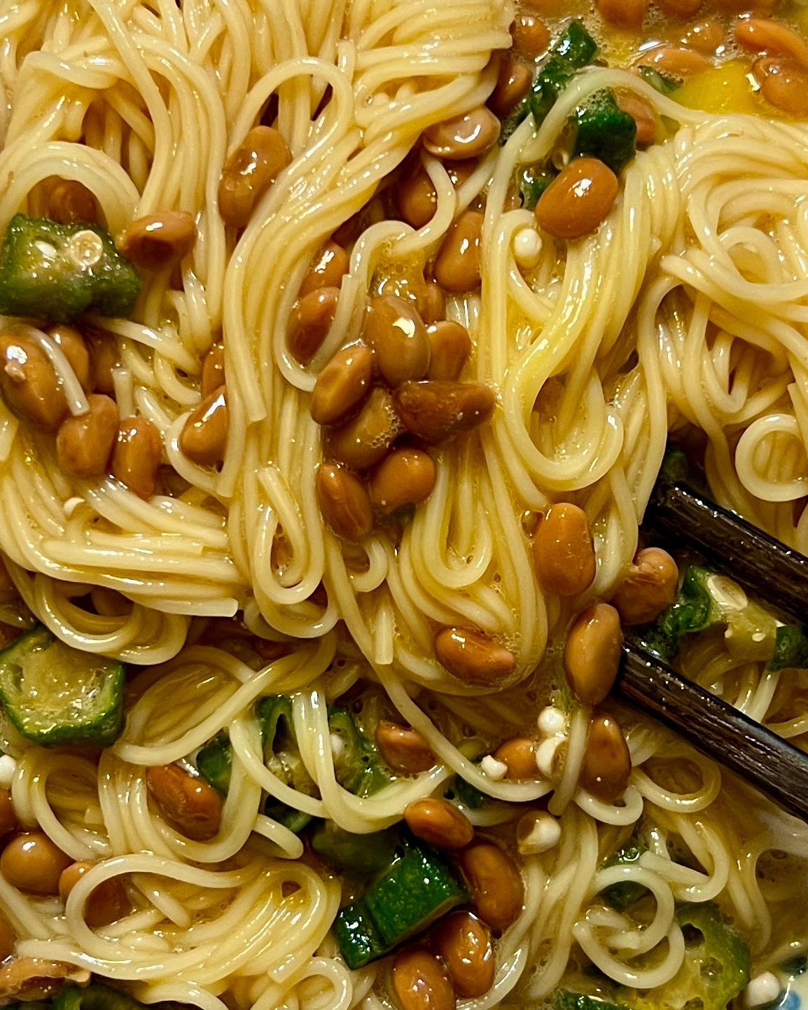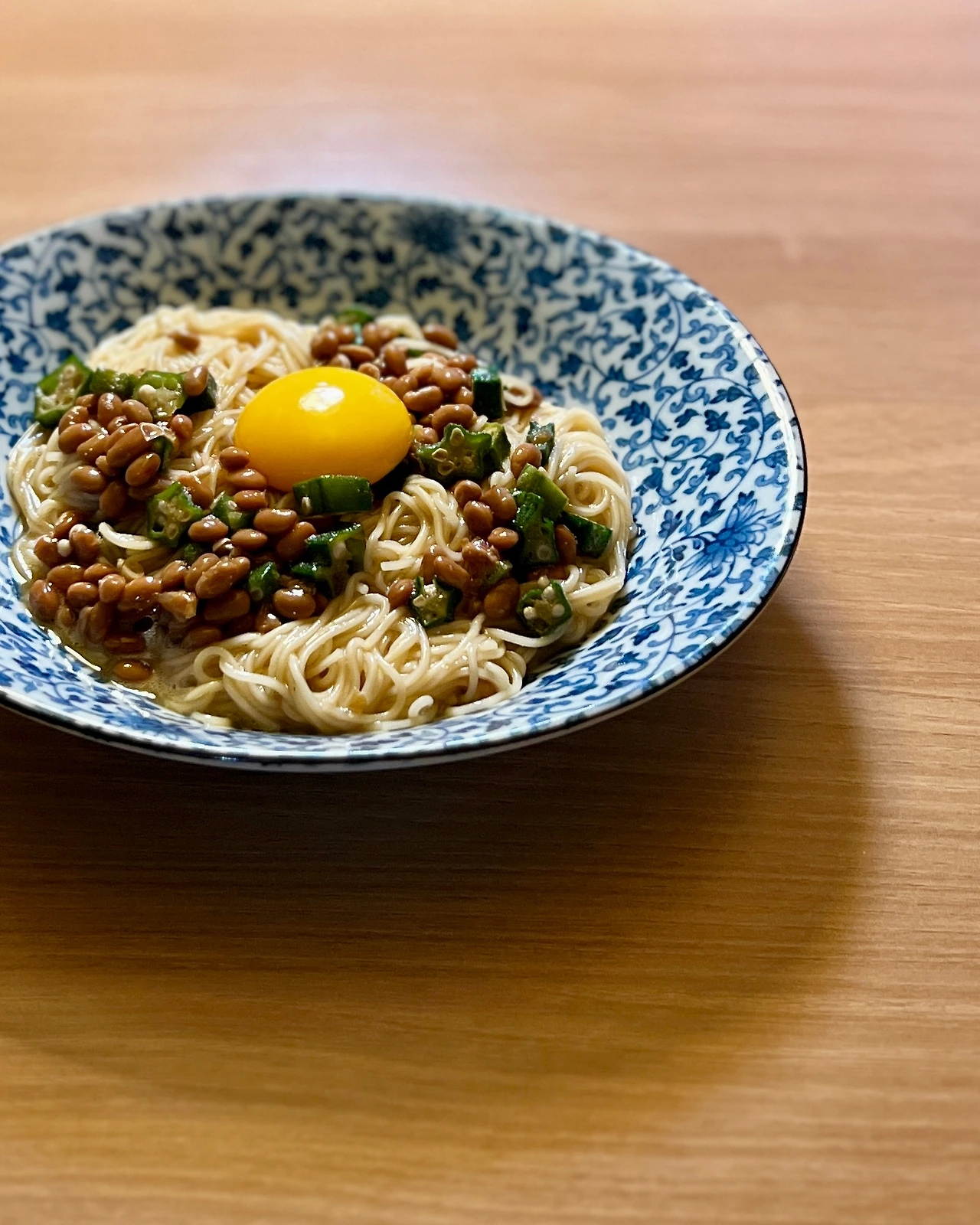 낫토 1개, 계란 1개, 오크라 2개, 소면 1인분, 들기름 1T, 쯔유 1T