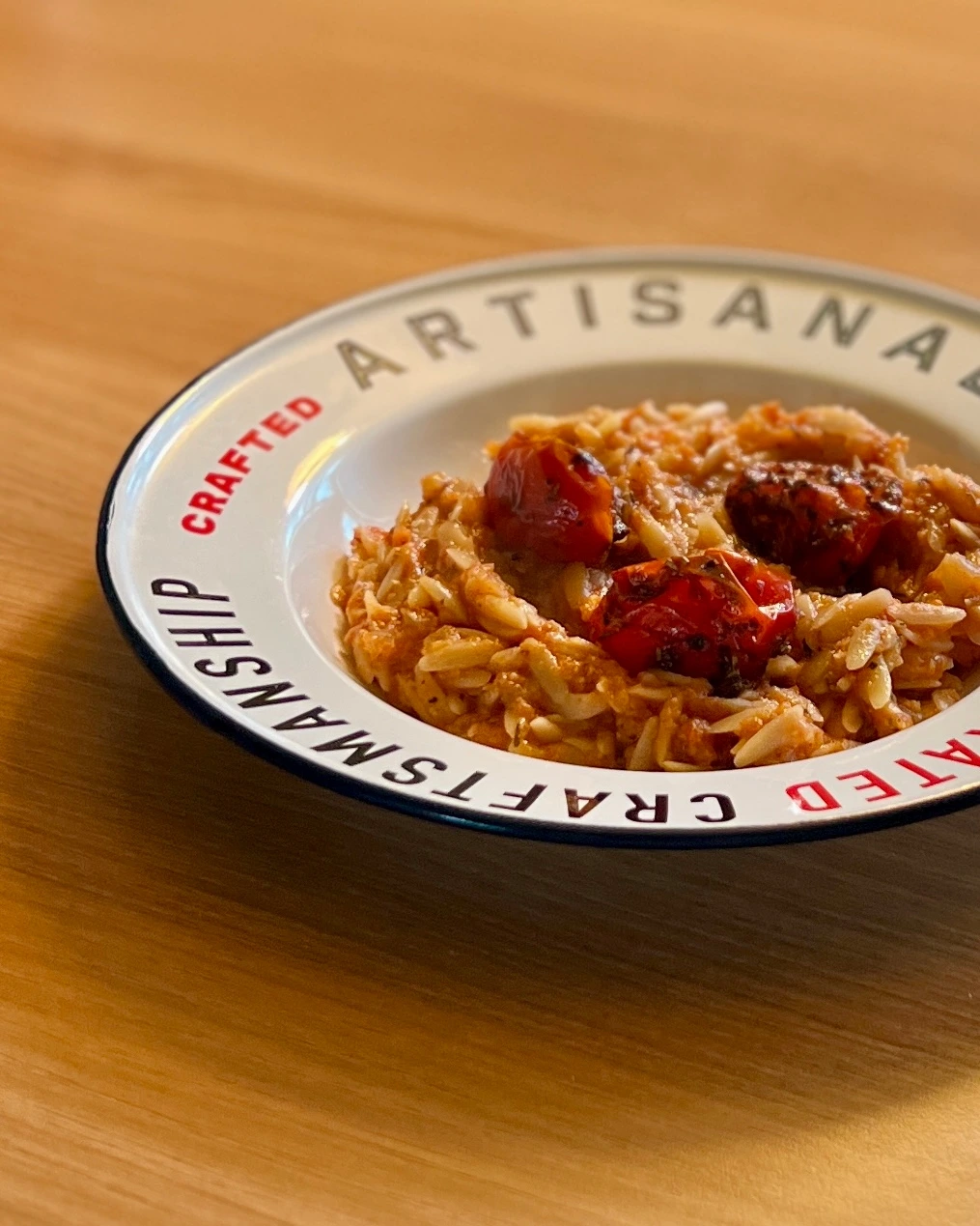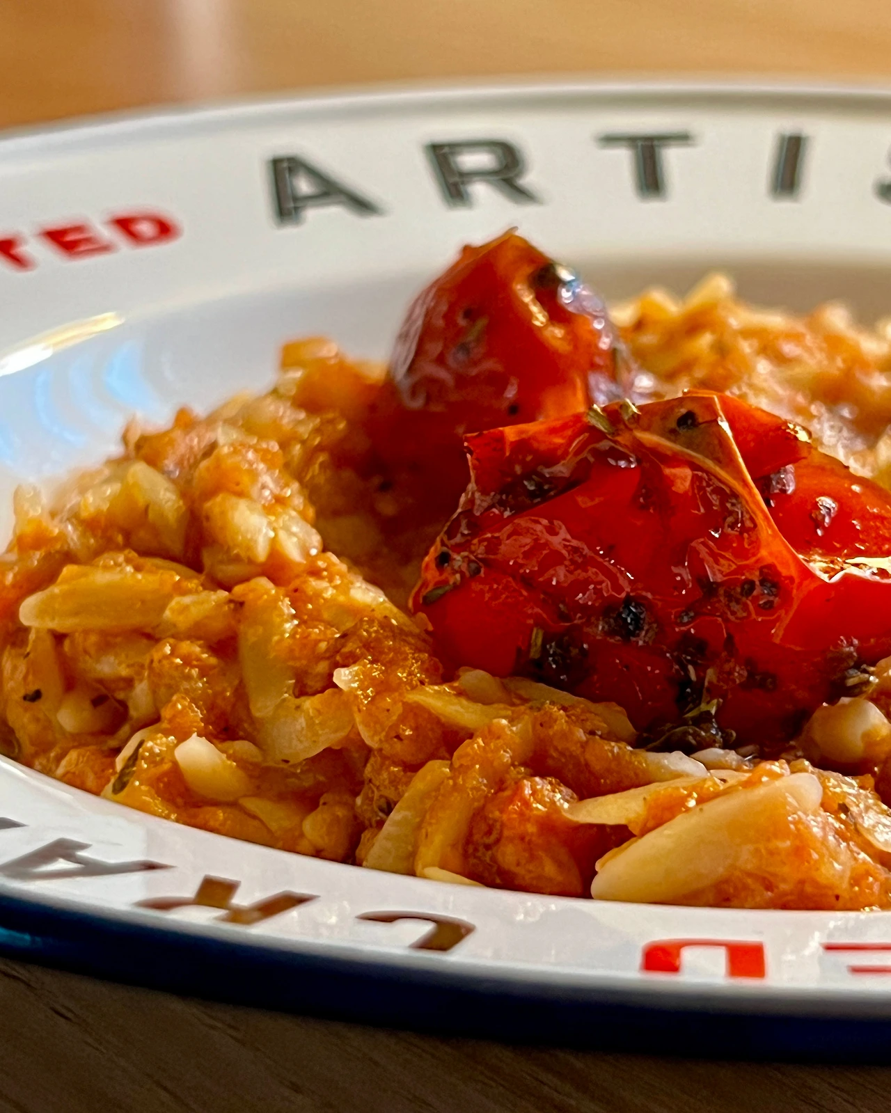 4. 오르조를 그릇에 담고 2의 토마토를 얹는다.