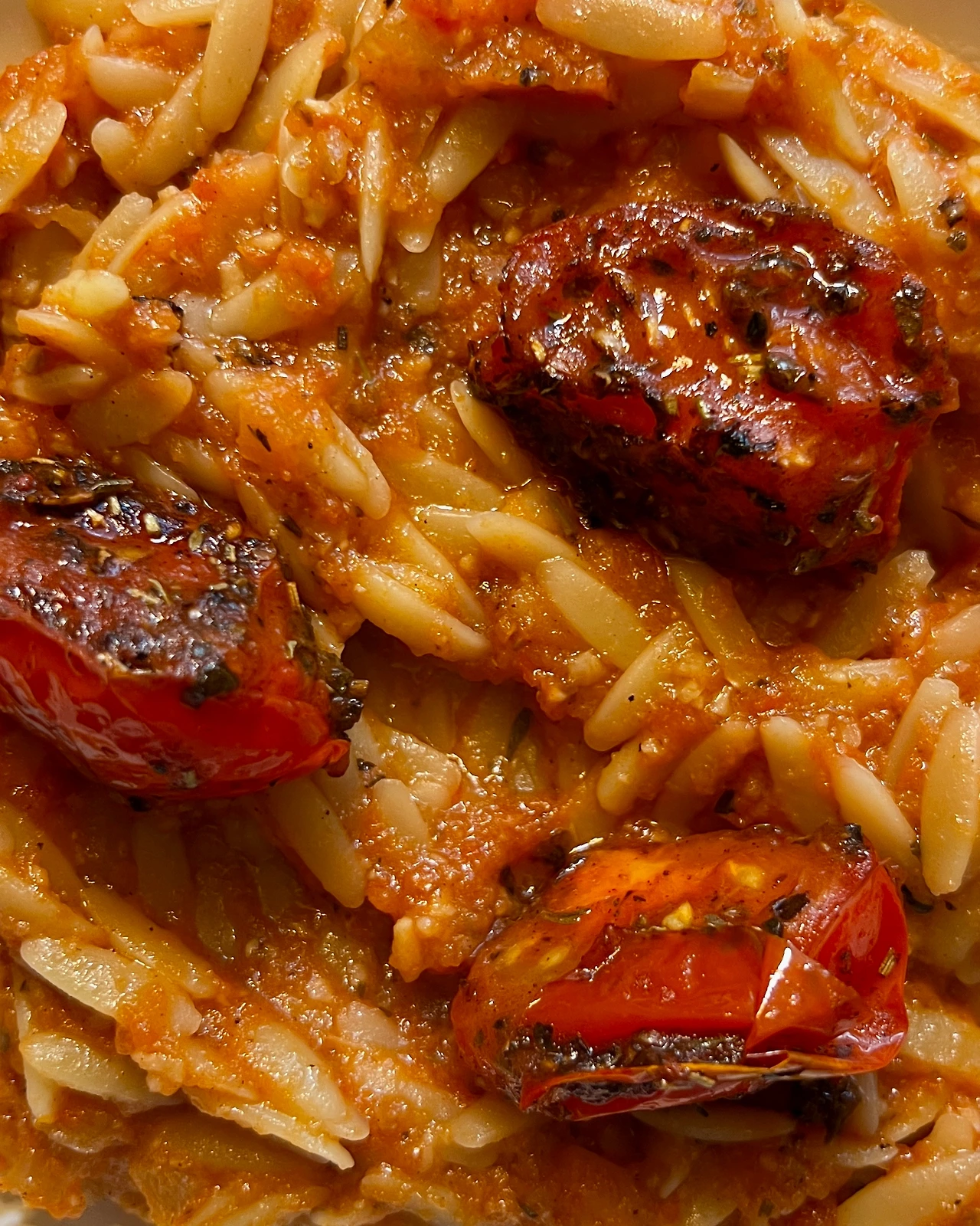 3. 팬에 올리브오일과 다진 마늘 조금 넣고 살짝 볶은 뒤 토마토소스 붓고 1의 오르조를 넣고 끓인다. 파마산치즈를 넣고 골고루 섞는다.