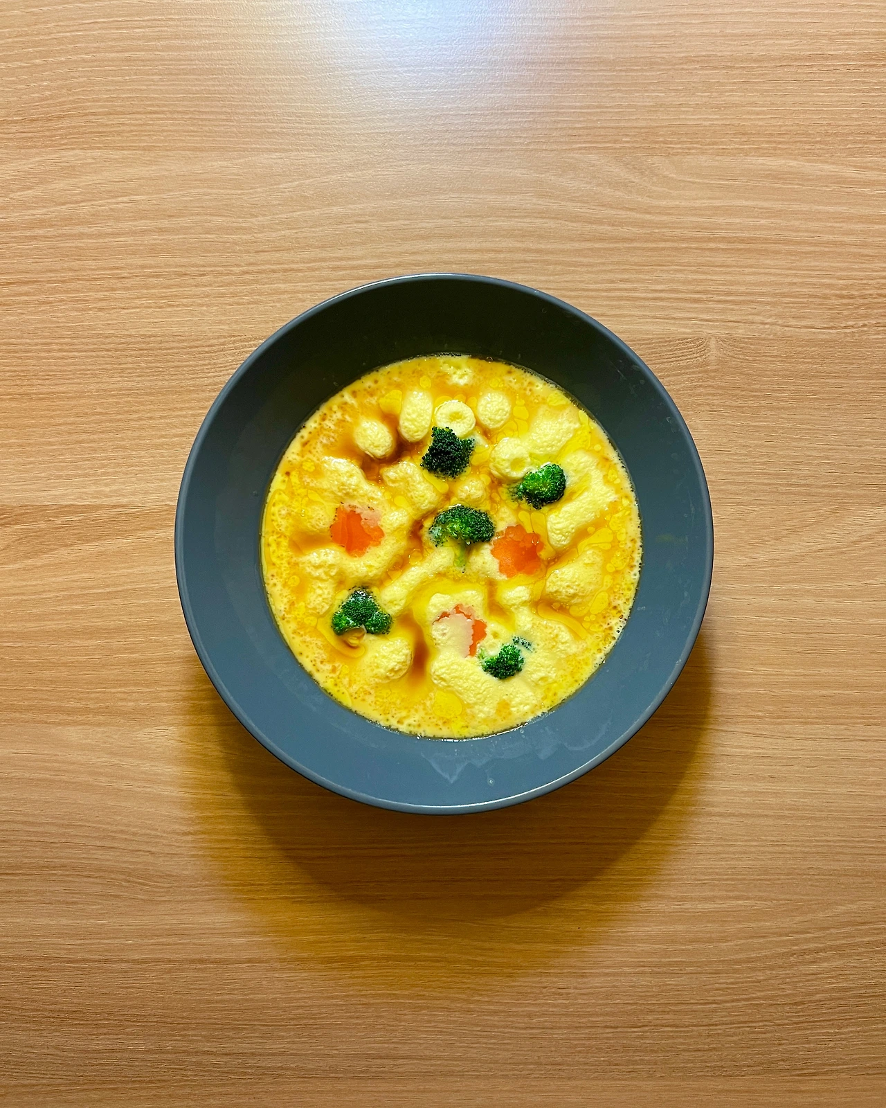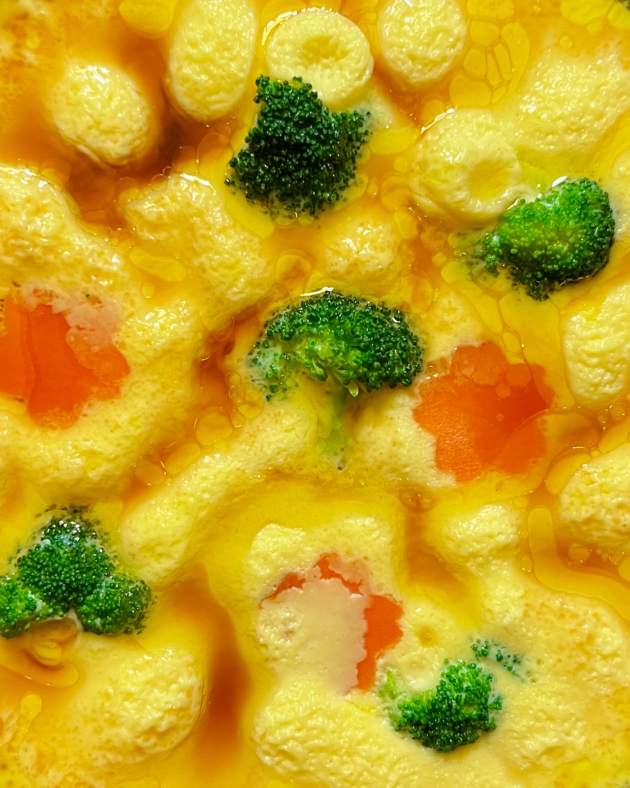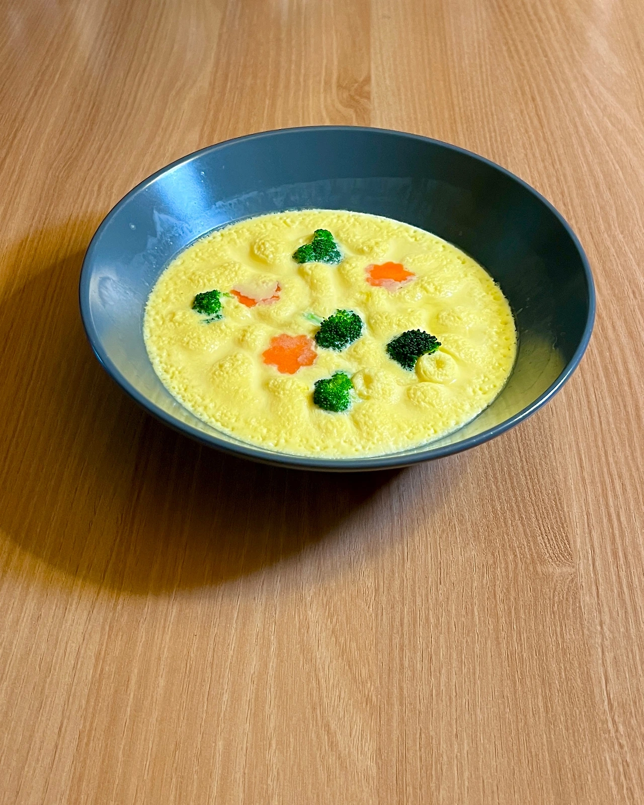 계란 3개, 물 100ml, 쯔유 1T, 참기름 1T 그리고 소금 한 꼬집, 브로콜리, 당근 조금