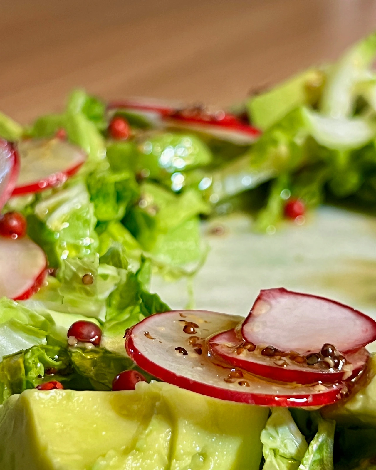 봄동 1/4개, 아보카도 1/2개, 래디시 2개, 핑크페퍼 조금, (드레싱) 올리브오일 3T, 화이트와인 비니거 1T, 홀그레인 머스터드 1t