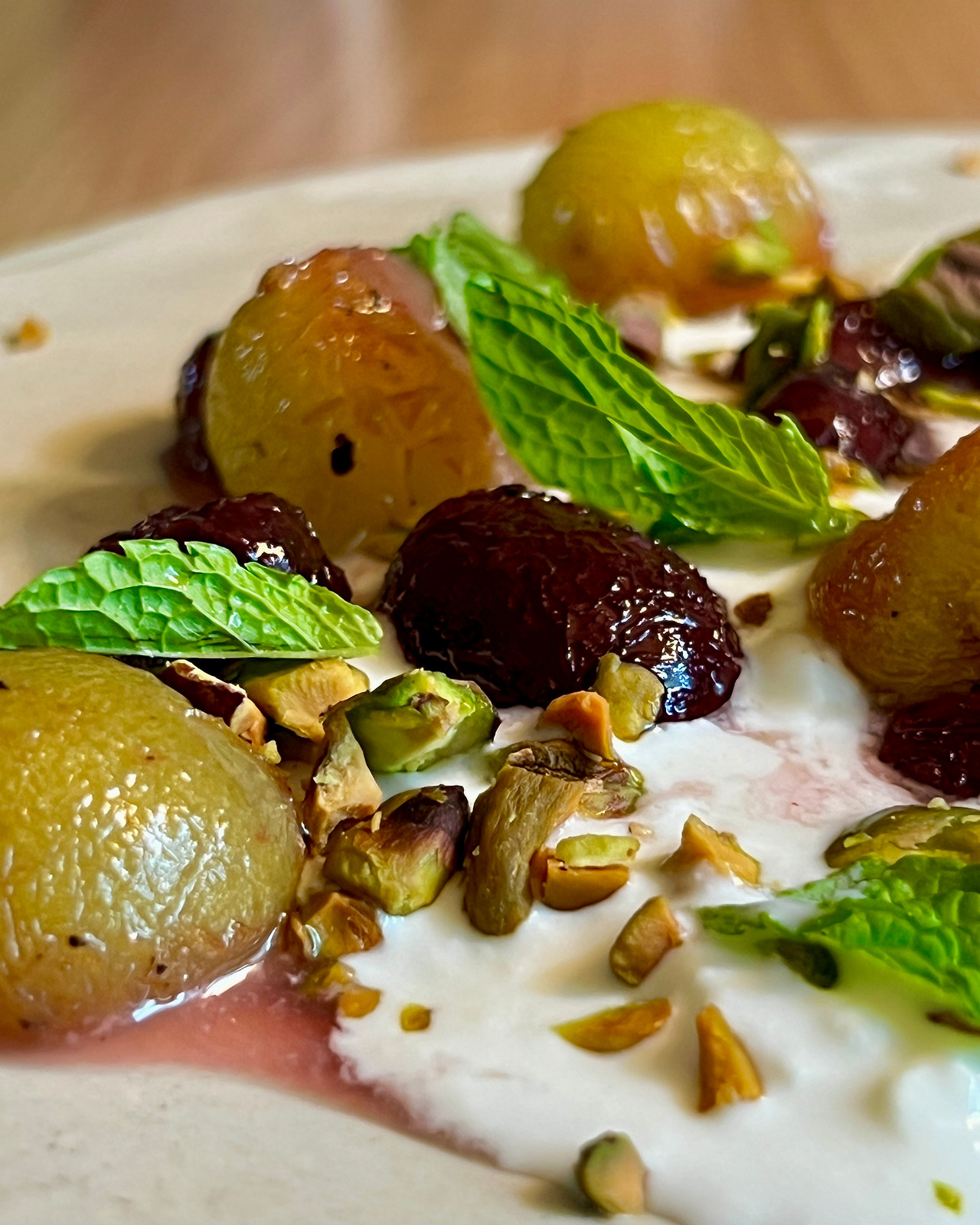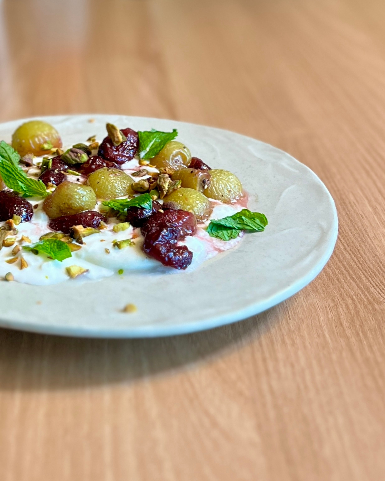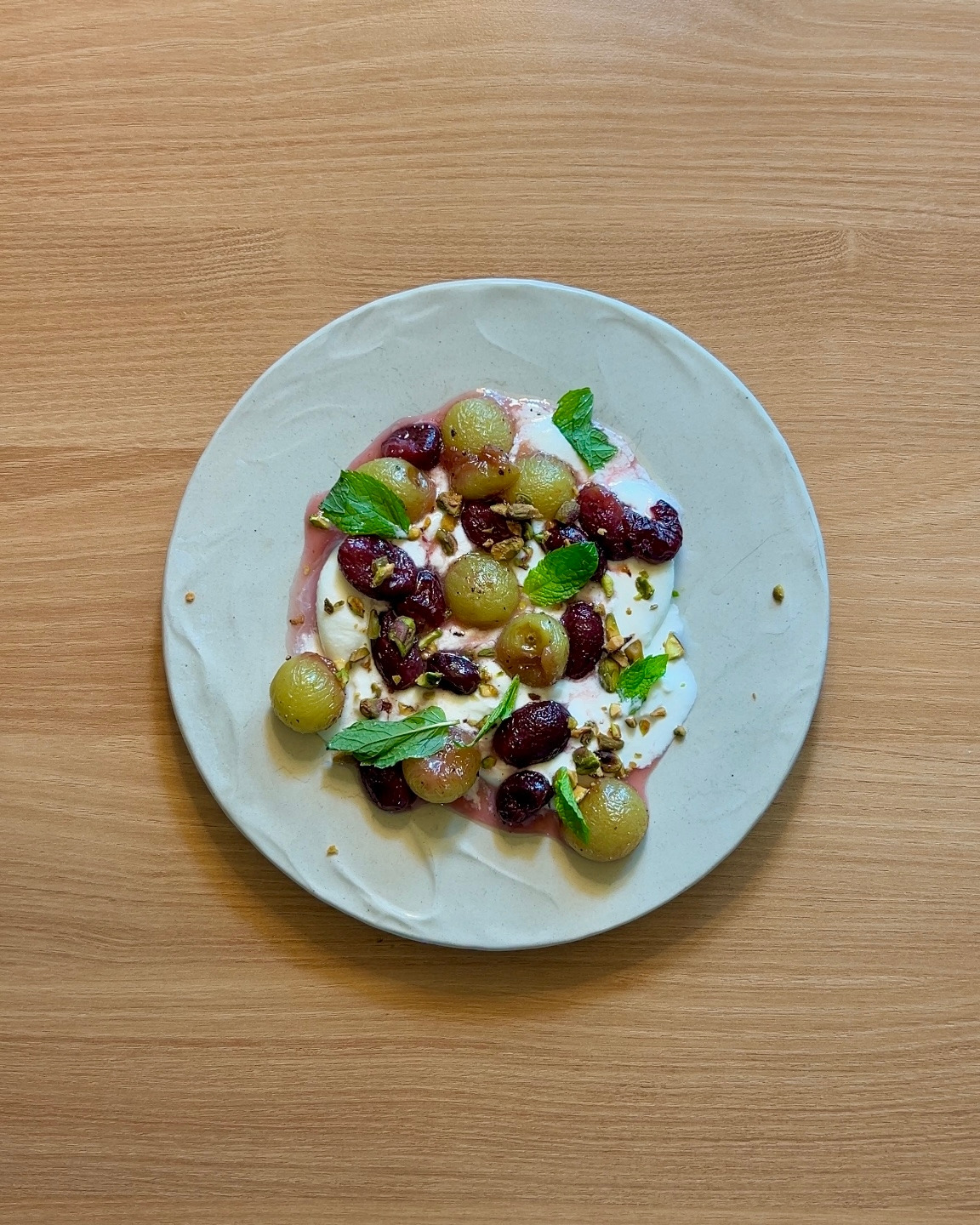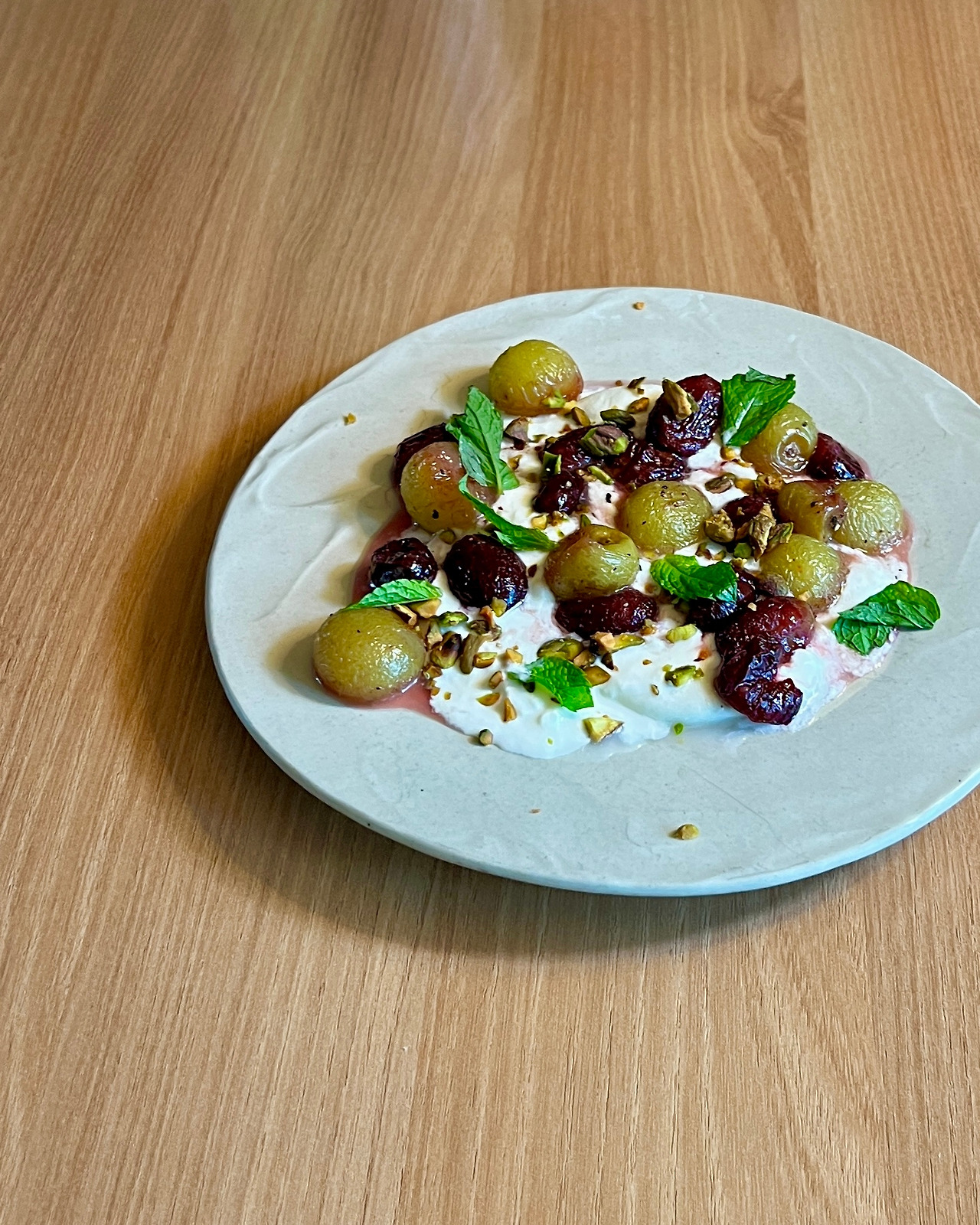 2. 그릇에 부라타치즈 얹고 구운 포도, 발사믹 비니거, 다진 피스타치오와 민트 얹는다.