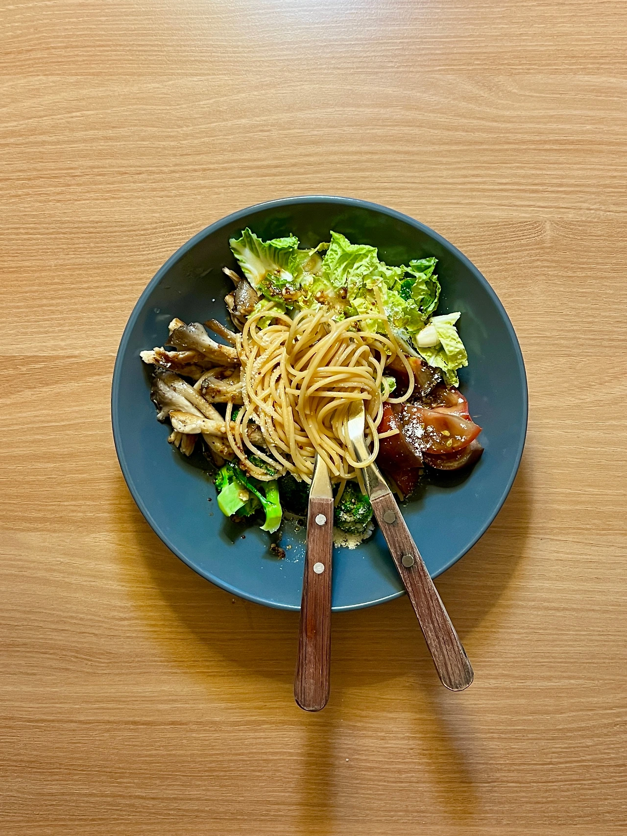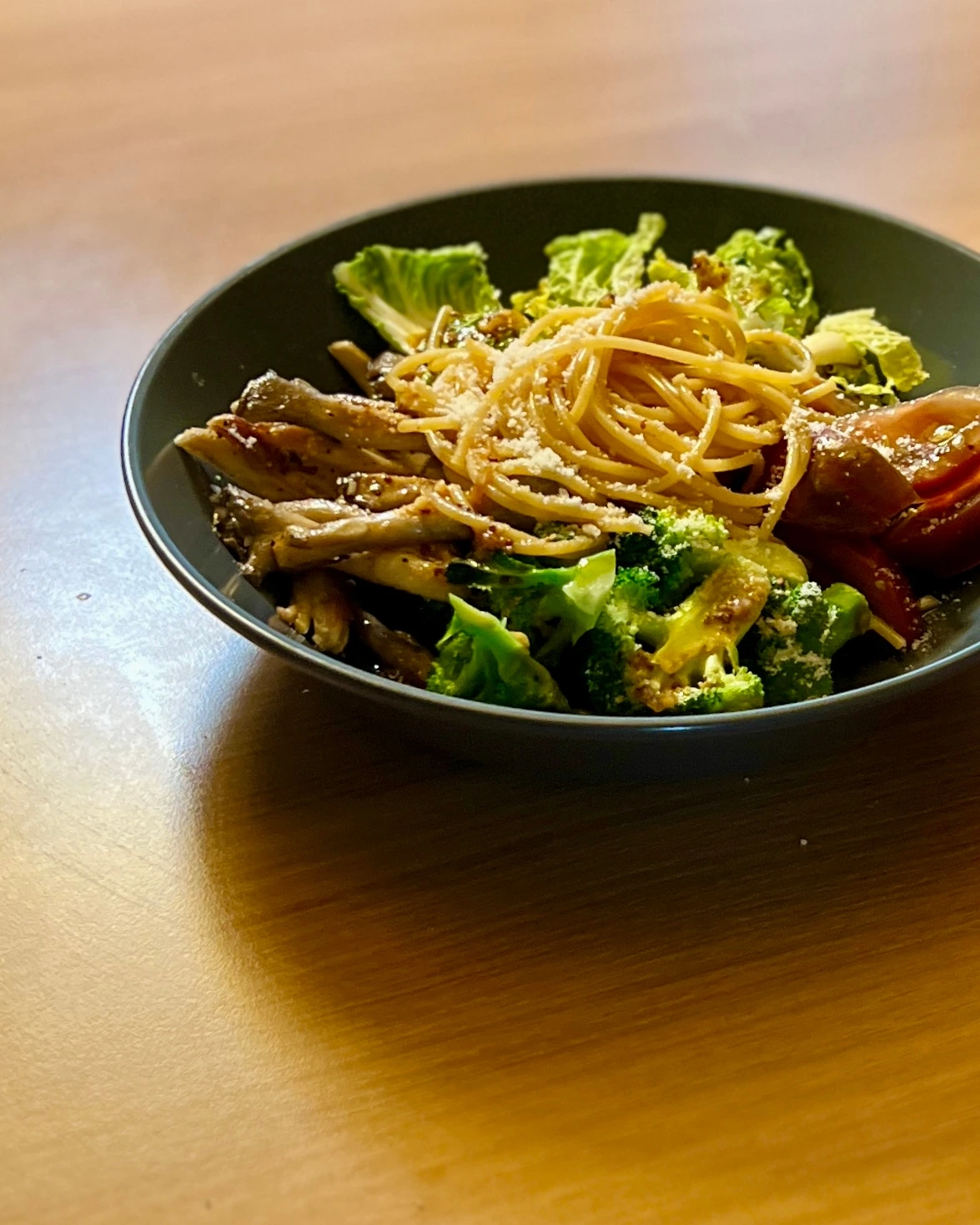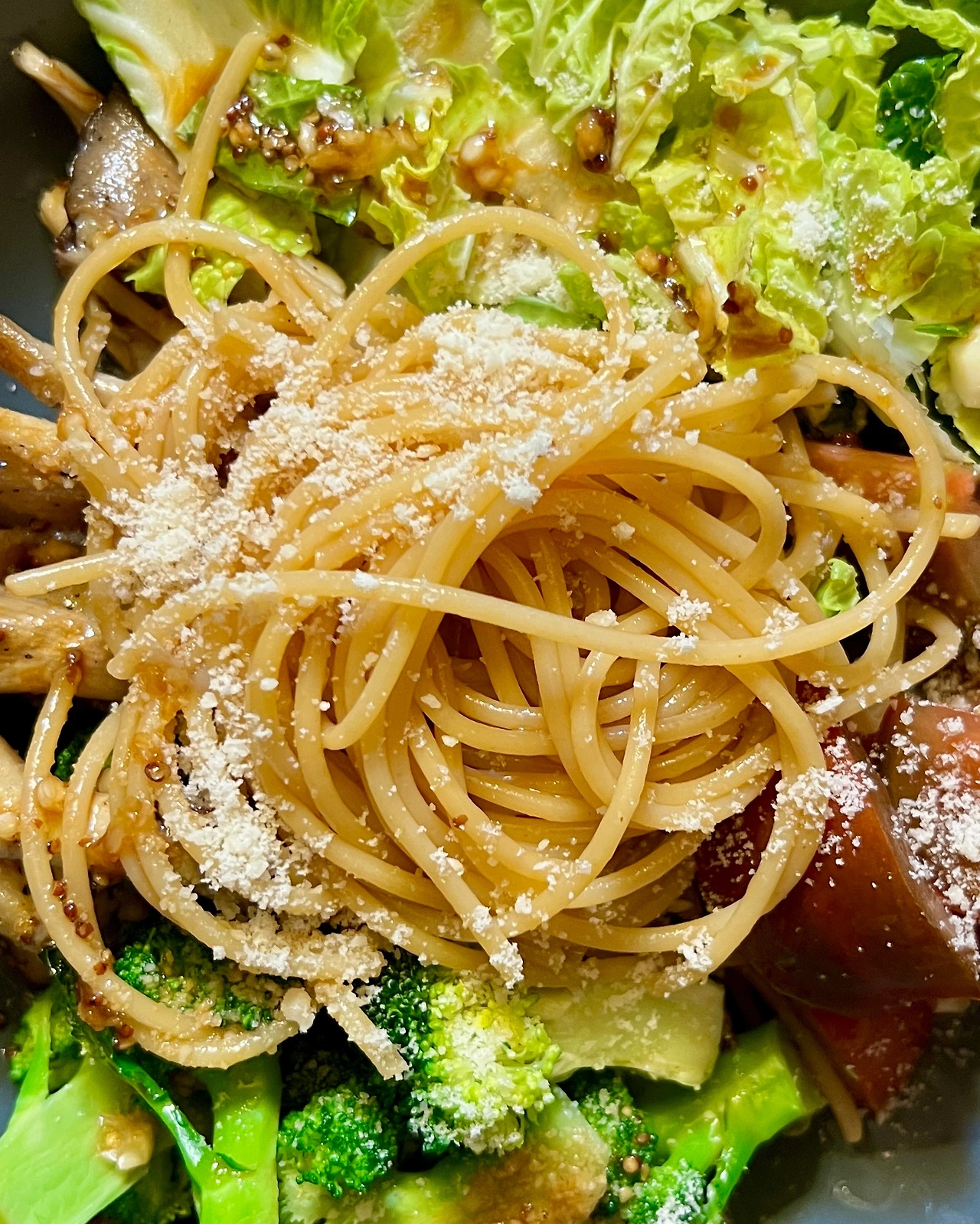 스파게티 1인분, 방울토마토 1컵, 브로콜리 1/2개, 고기느타리버섯 1컵, 봄동 조금, 파마산치즈, (드레싱) 레드와인 비니거 2T, 간장 1T, 올리브오일 2T, 다진마늘 1t, 홀그레인 머스터드 1t