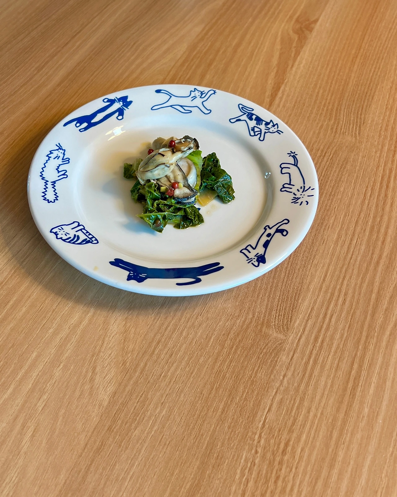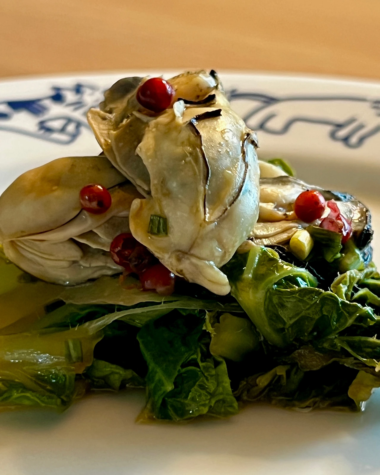 굴 150g, 봄동 조금, 대파 한 뿌리, 핑크페퍼와 버터 조금, (드레싱) 간장, 레몬주스, 와인비니거 1:1:1, 쪽파(옵션)