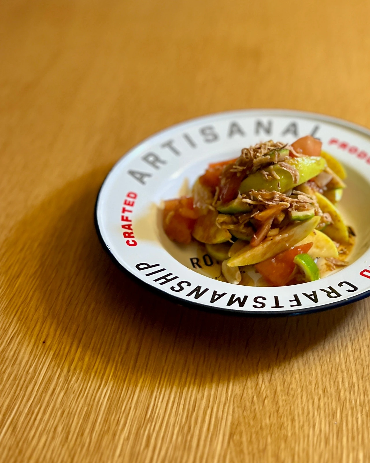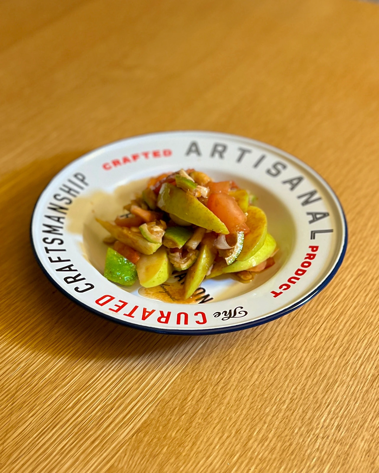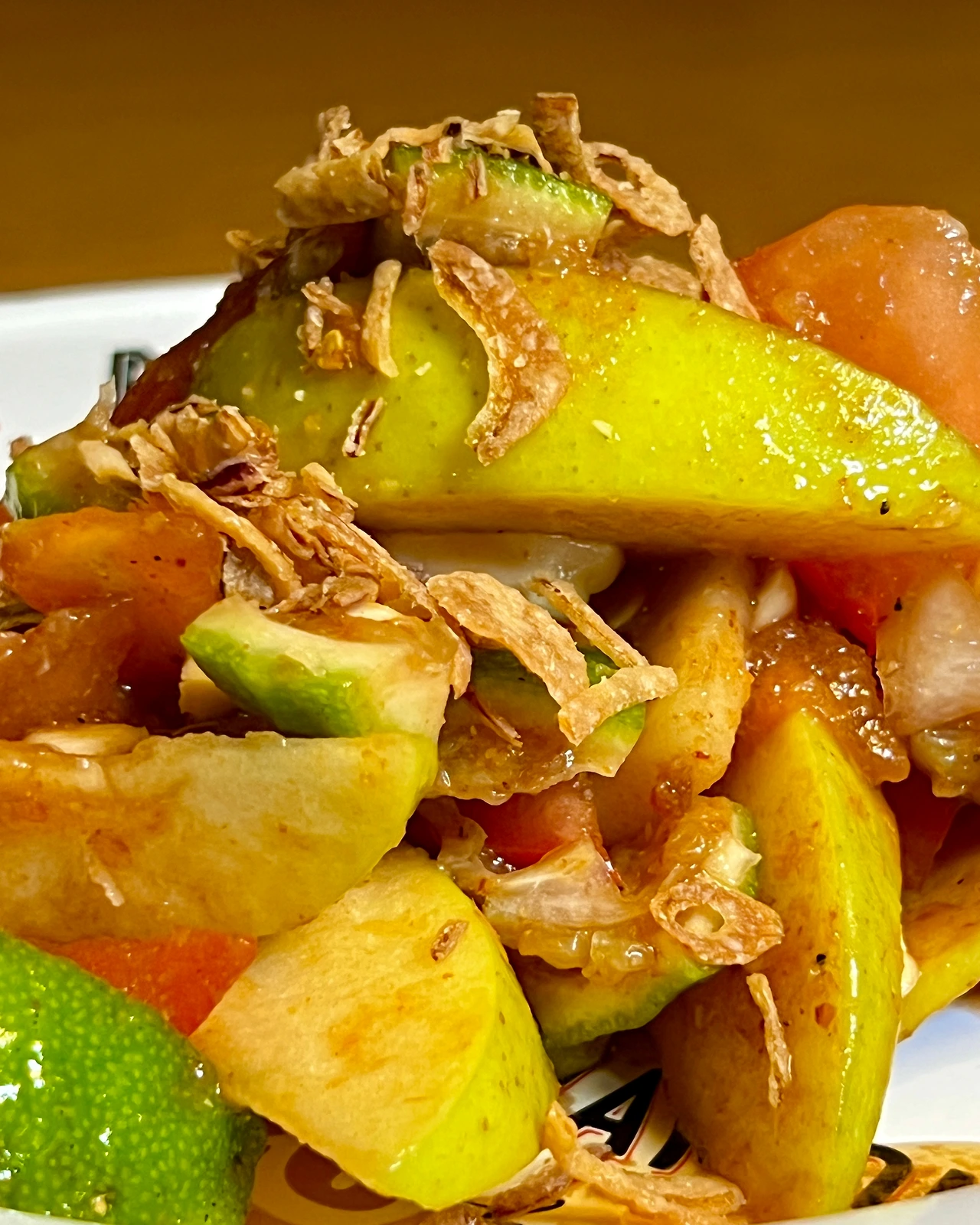 사과 1개, 토마토 1개, 땅콩 1T, 페페론치노 2개, 마늘 2개, 건새우 1T, 라임 1개, 프라이드 샬롯 1T, (드레싱) 타마린 소스 1T, 피시 소스 1T, 코코넛 슈가 1t