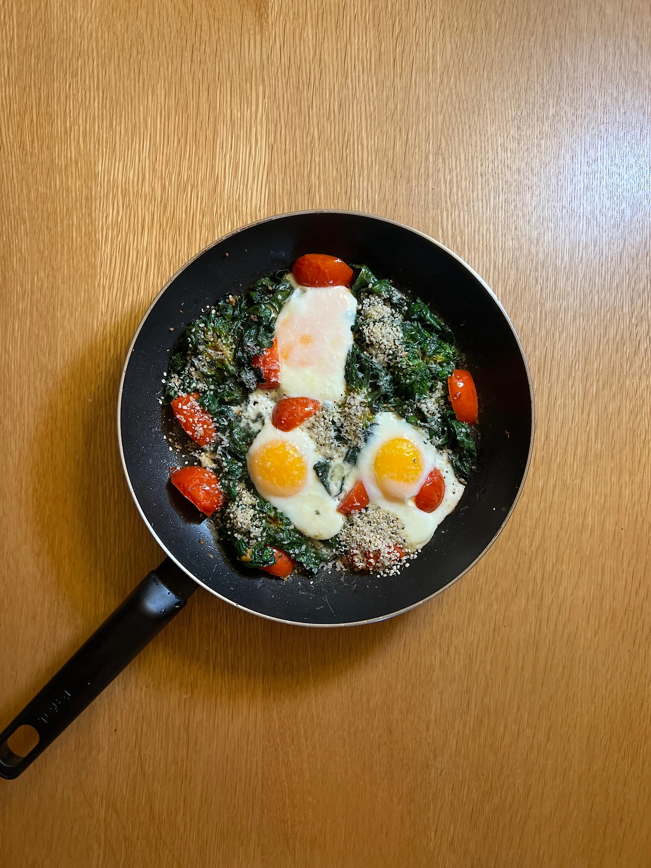 시금치 4 뿌리, 마늘 5개, 토마토 3개, 계란 3개, 햄프시드 1T, 그라나파다노 치즈와 소금, 후추, 레몬주스 1t