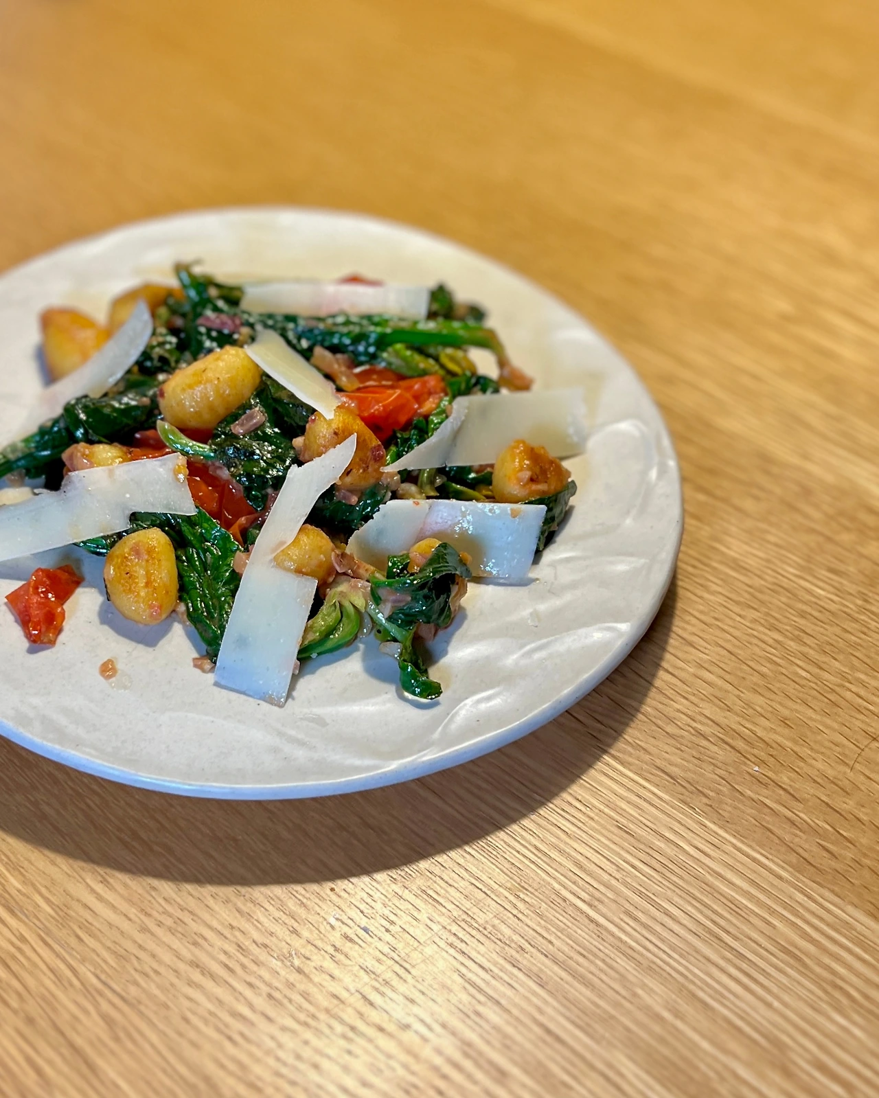 뇨끼 1컵, 시금치 2 뿌리, 토마토 3개, 양파 1/4개, 마늘 2개, 올리브오일, 소금 한 꼬집, 후추, 버터 1t, 그라나 파다노 치즈 조금