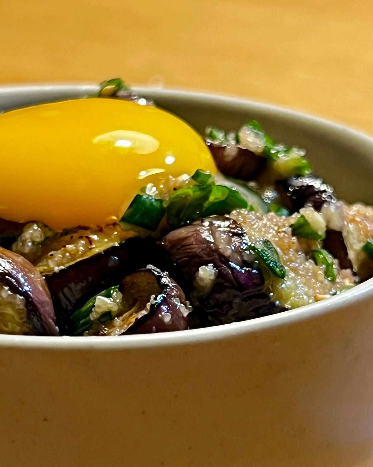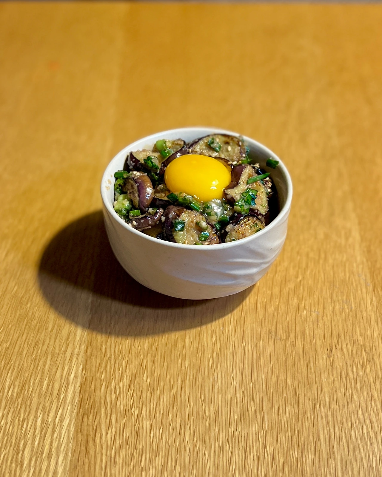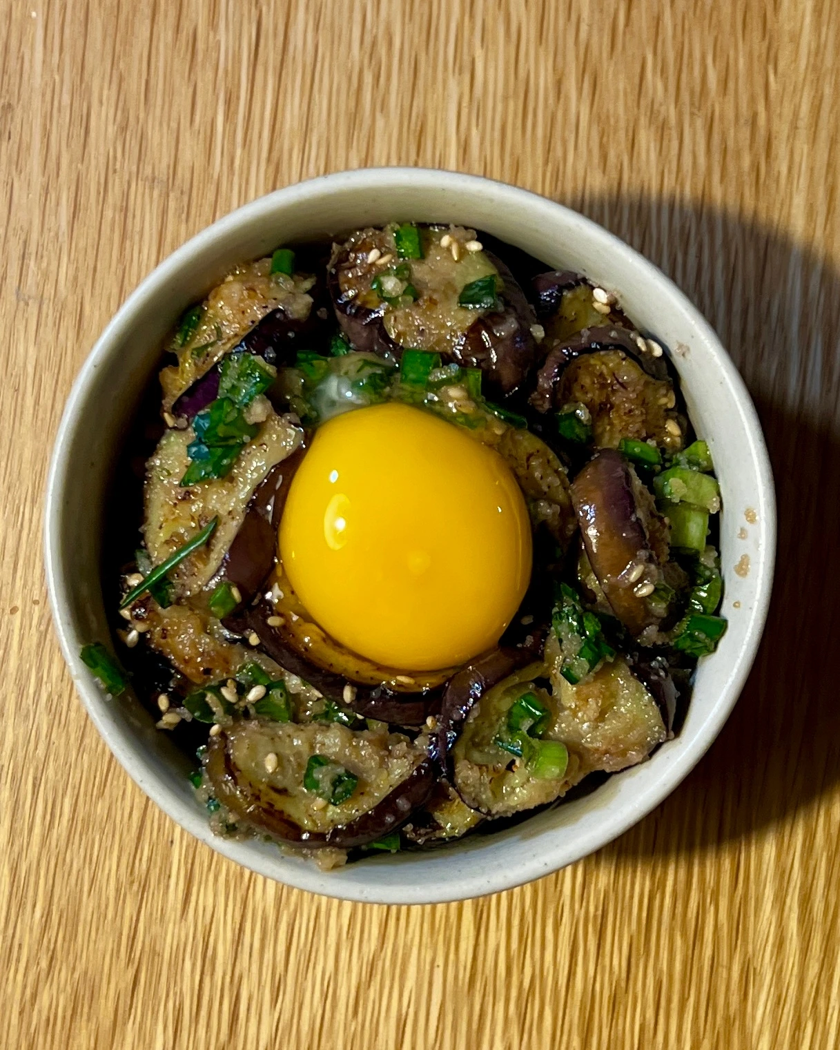 현미밥 1/2 공기, 가지 2개, (알만 바른) 명란 3T, 다진 쪽파 2T, 다진 마늘 1T, 간장 1T, 참기름 1T, 볶은 참깨 1T, 계란노른자