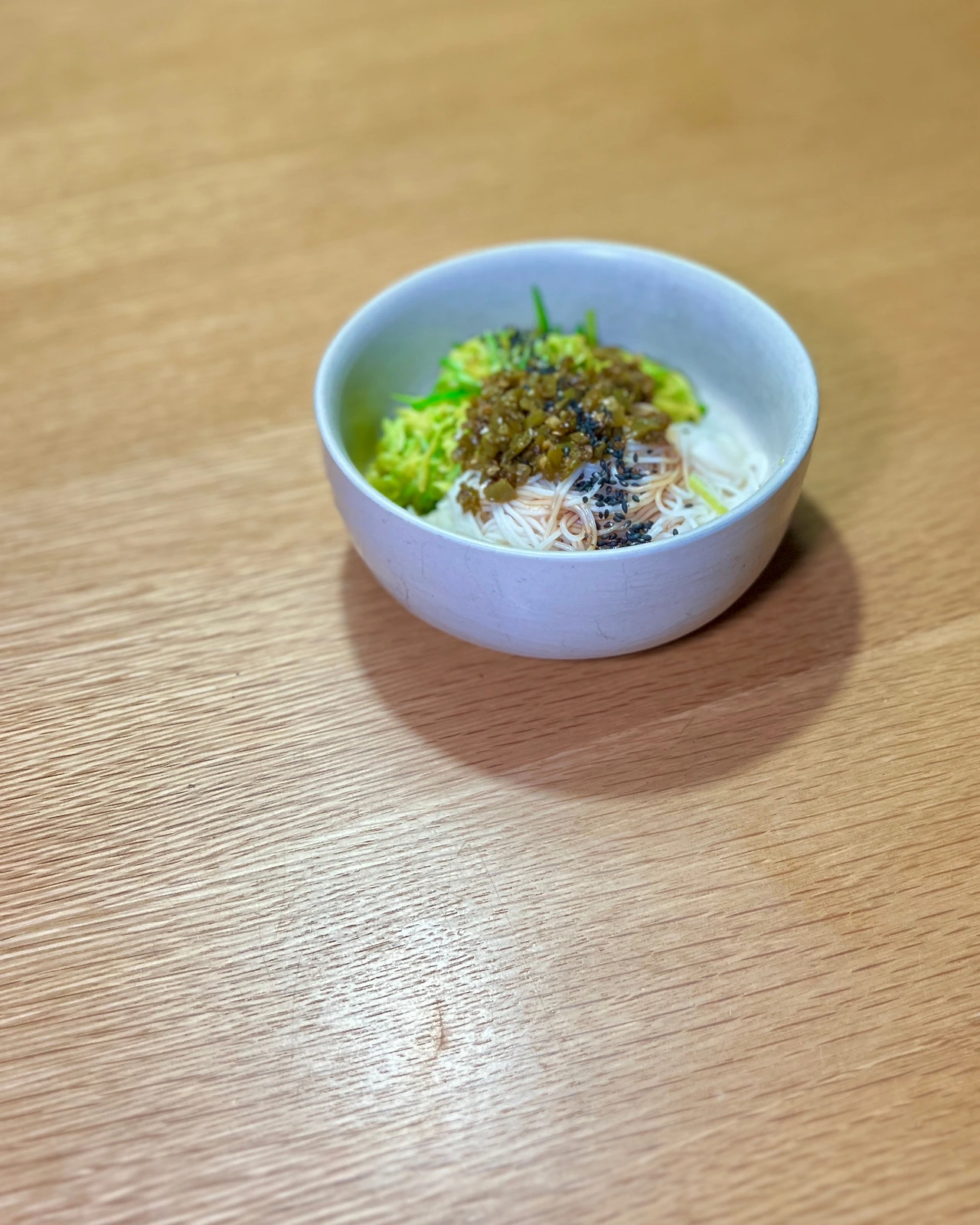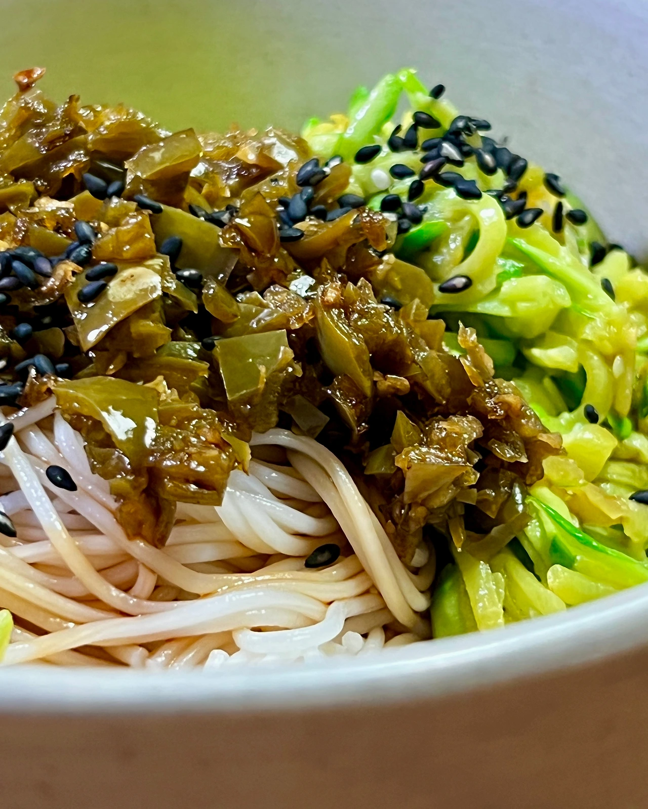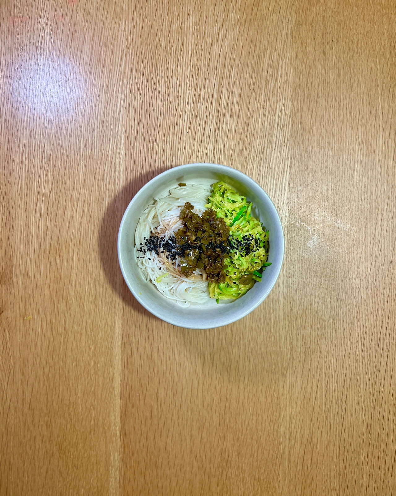 4. 삶은 국수를 그릇에 담고 간장 1T, 들기름에 볶은 애호박, 고추장아찌 얹고 검은깨 뿌린다. 먹기 전에 들기름 조금 넣는다.