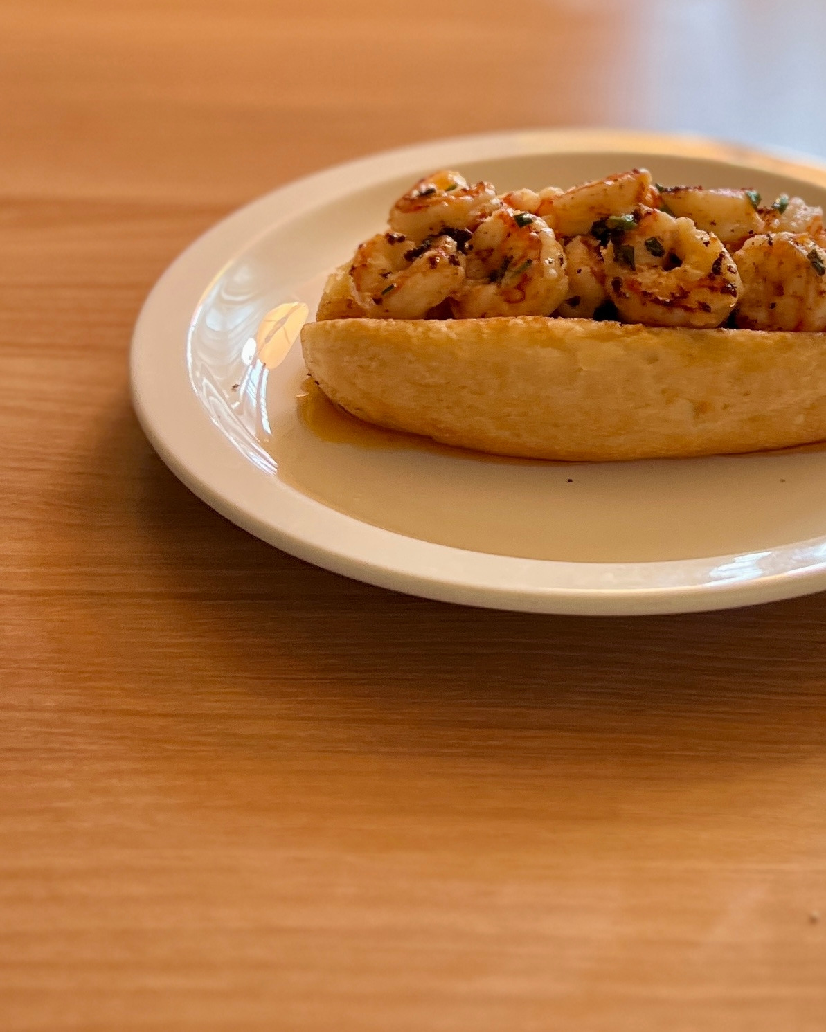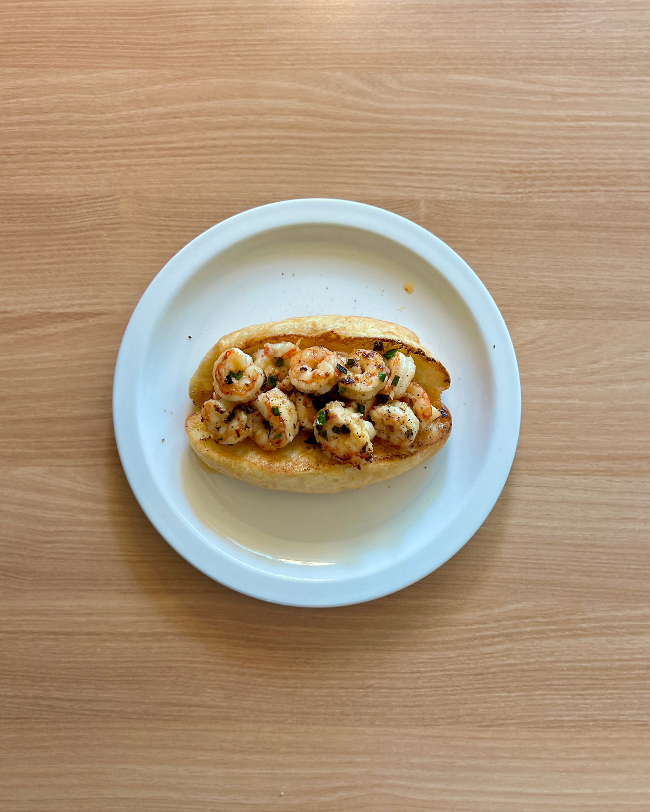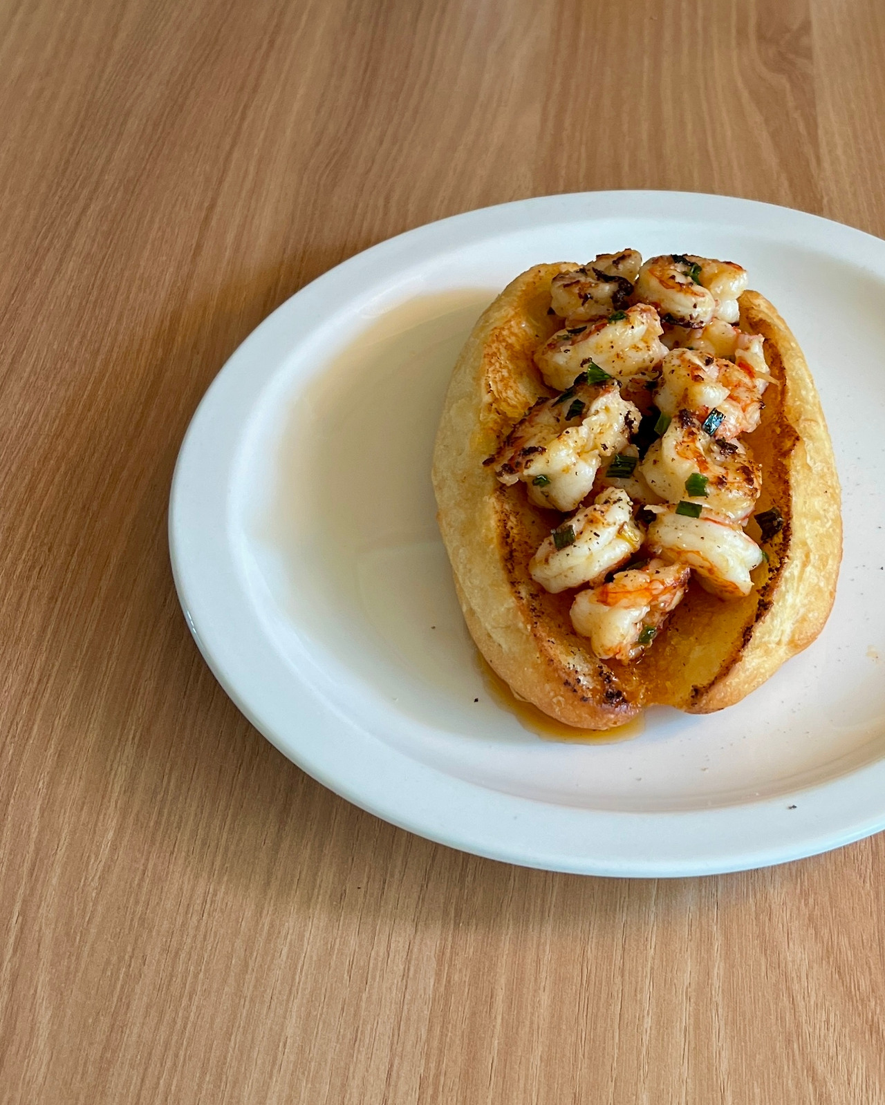 4. 접시에 미니 바게트 담고 3의 새우를 푸짐하게 얹는다. 팬에 남은 버터도 골고루 끼얹는다. 후추로 마무리~
