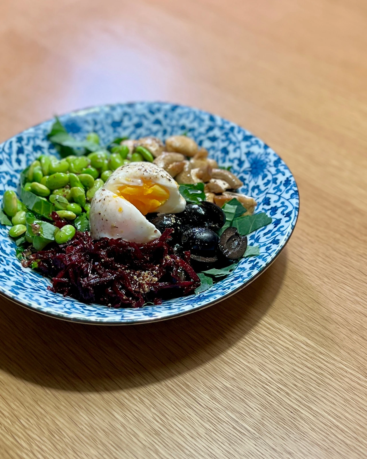 케일 5장, 양송이버섯 5개, 풋콩 1컵, 비트 사워크라우트 1T, 블랙올리브 1/2컵, 계란 1개, 후추, 레몬주스, (버섯소스) 간장 2T, 미소 1T, 다진 마늘 1T, 메이플시럽 1T, (드레싱) 올리브오일 2T, 레드와인 비니거 1T, 홀그레인 머스터드 1t